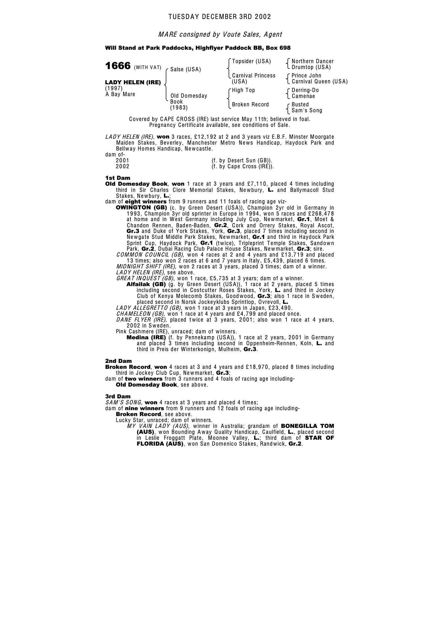 December Mare Sale 2001 lot 1157 Lady Helen (IRE) (M.), Woodtown House Stud, Ireland=>Vendor 26,000 gns