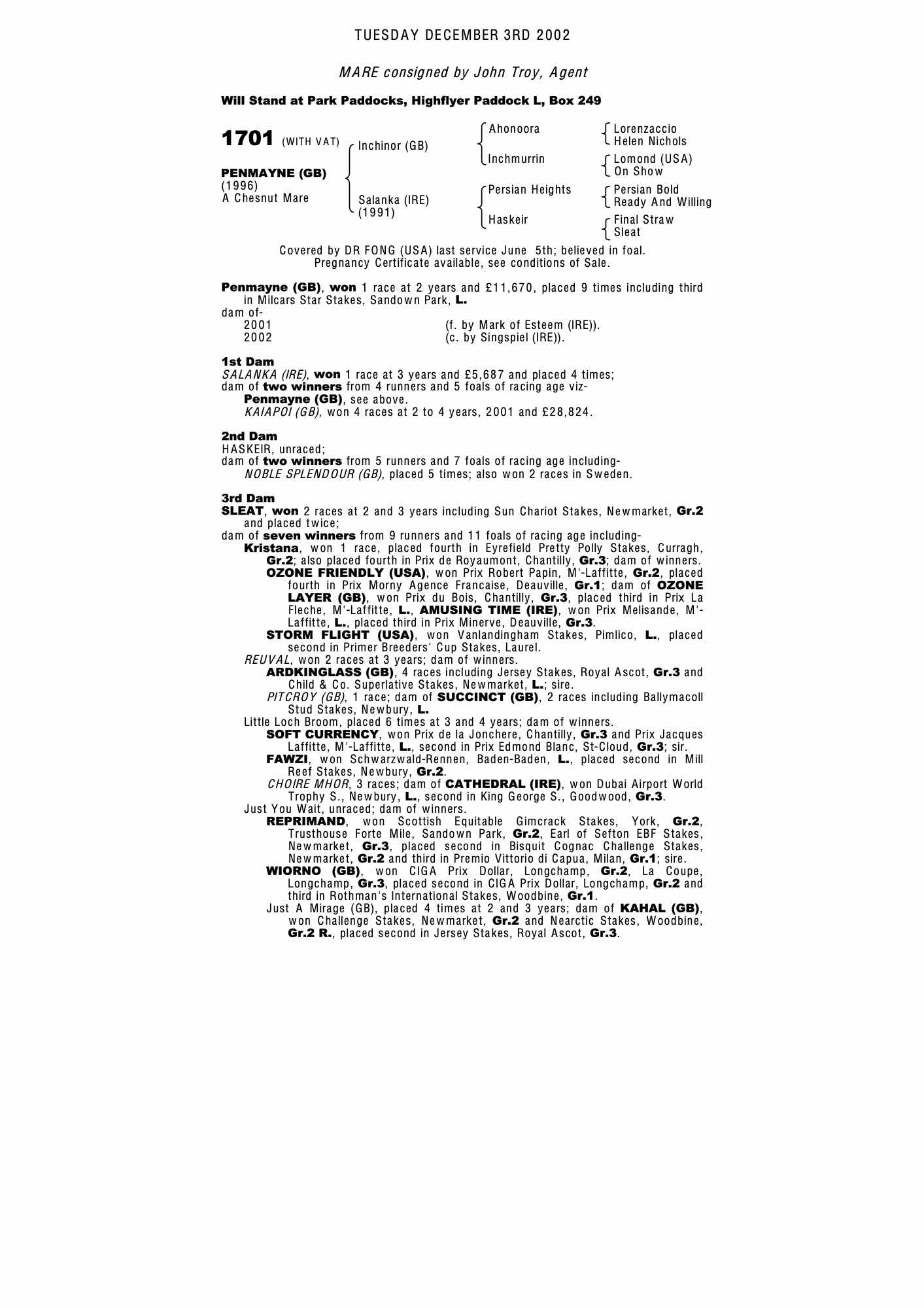 December Mare Sale 1999 lot 2196 Penmayne (GB) (F.), Whitsbury Manor Racing Stables=>Elmhurst Bloodstock 20,000 gns