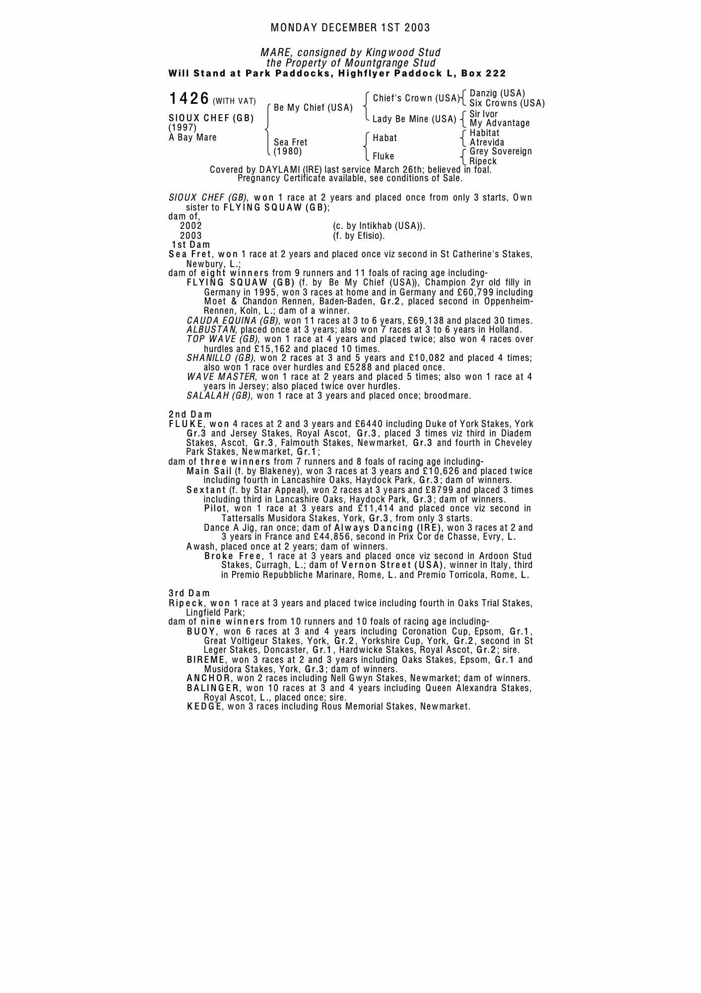 December Mare Sale 2003 lot 1874 Flying Squaw (GB) (M.), The Castlebridge Consignment=>Vendor 50,000 gns