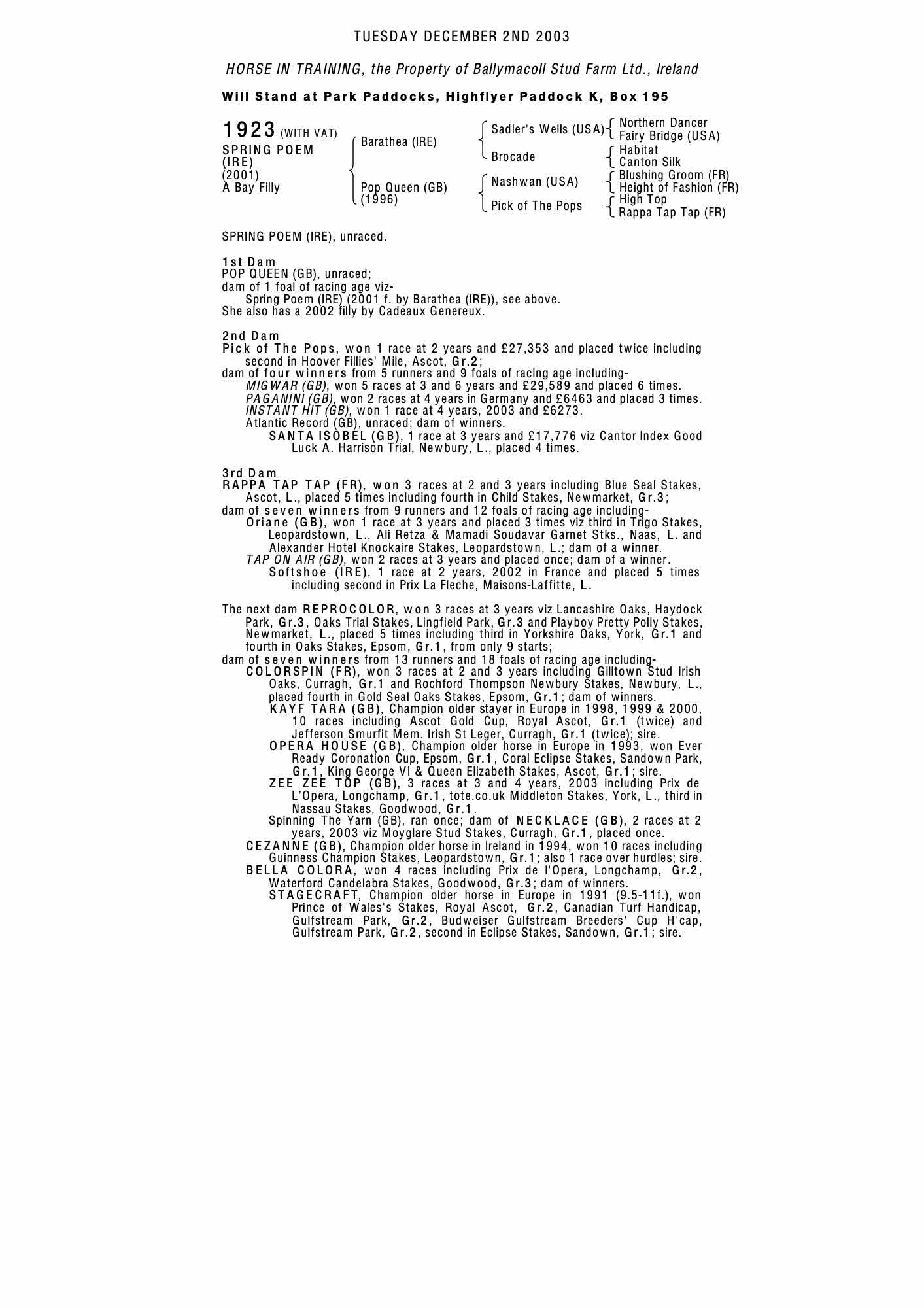 December Yearling Sale 2003 lot 195 F. by Cadeaux Genereux 2002, Kildaragh Stud, Ireland=>William Haggas 22,000 gns