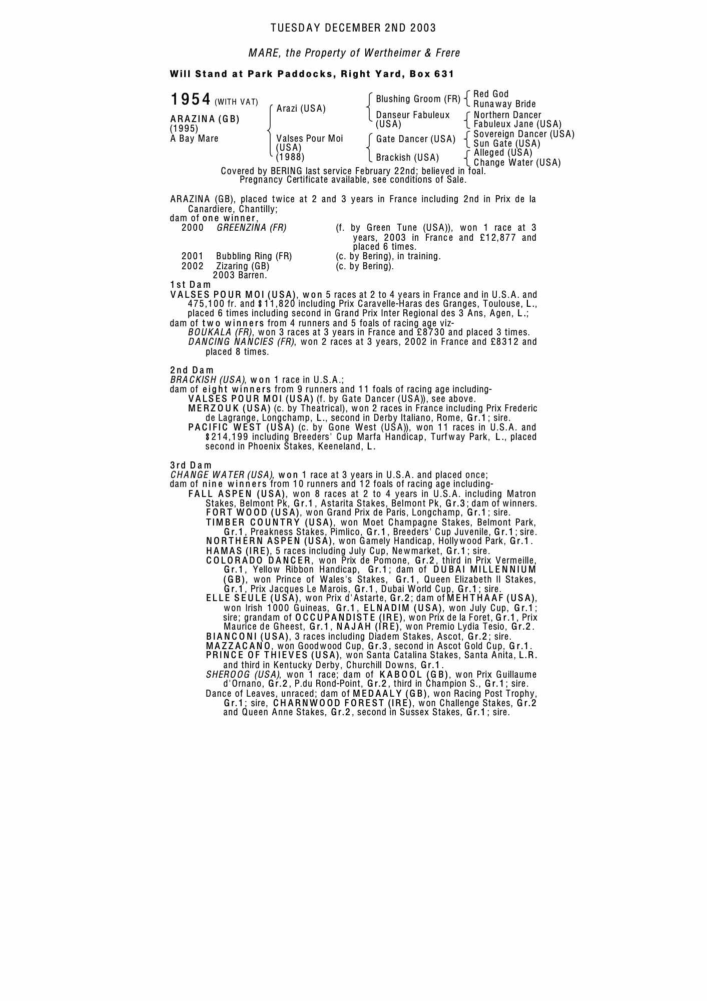 December Mare Sale 2002 lot 1524 Dancing Nancies (FR) (F. by Sadler's Wells (USA)), Ecurie J.C. Rouget, France=>Vendor 38,000 gns
