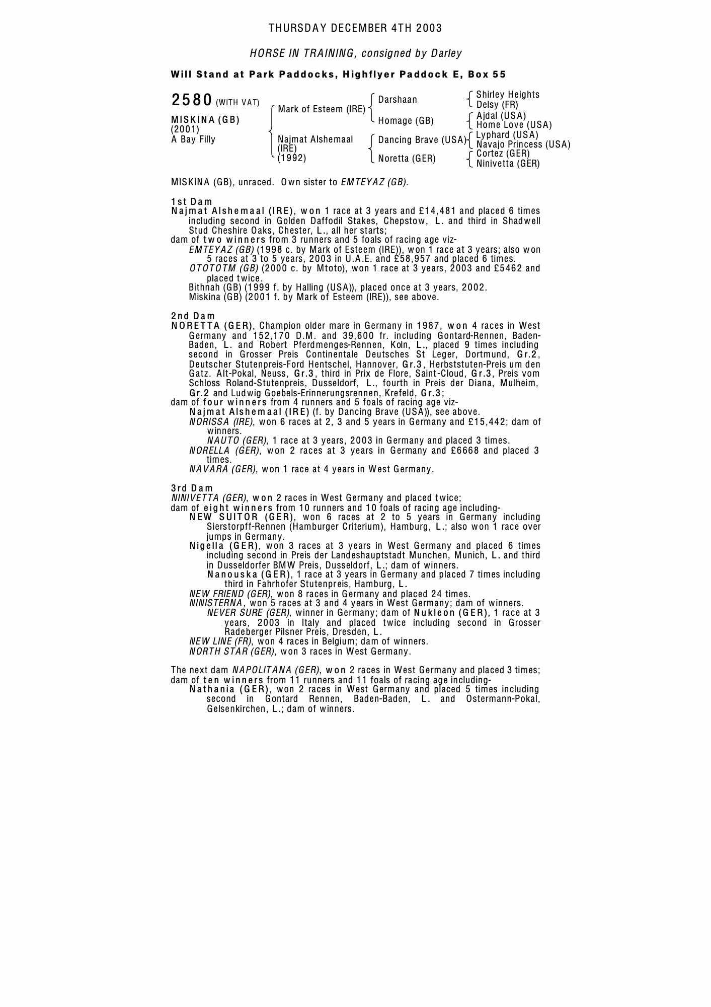 July Sale 2002 lot 518 Bithnah (GB) (F. by Halling (USA)), Darley=>Leon Cohen 4,000 gns