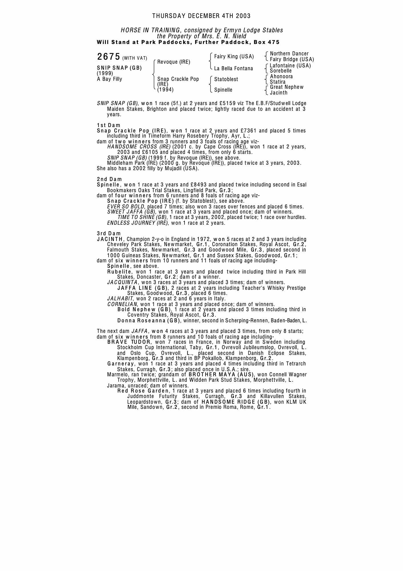 October Yearling Sale, Book 2 2004 lot 1829 F. by Efisio 2003, Grove Farm Stud, Newmarket=>Linda Tate Bloodstock 13,000 gns