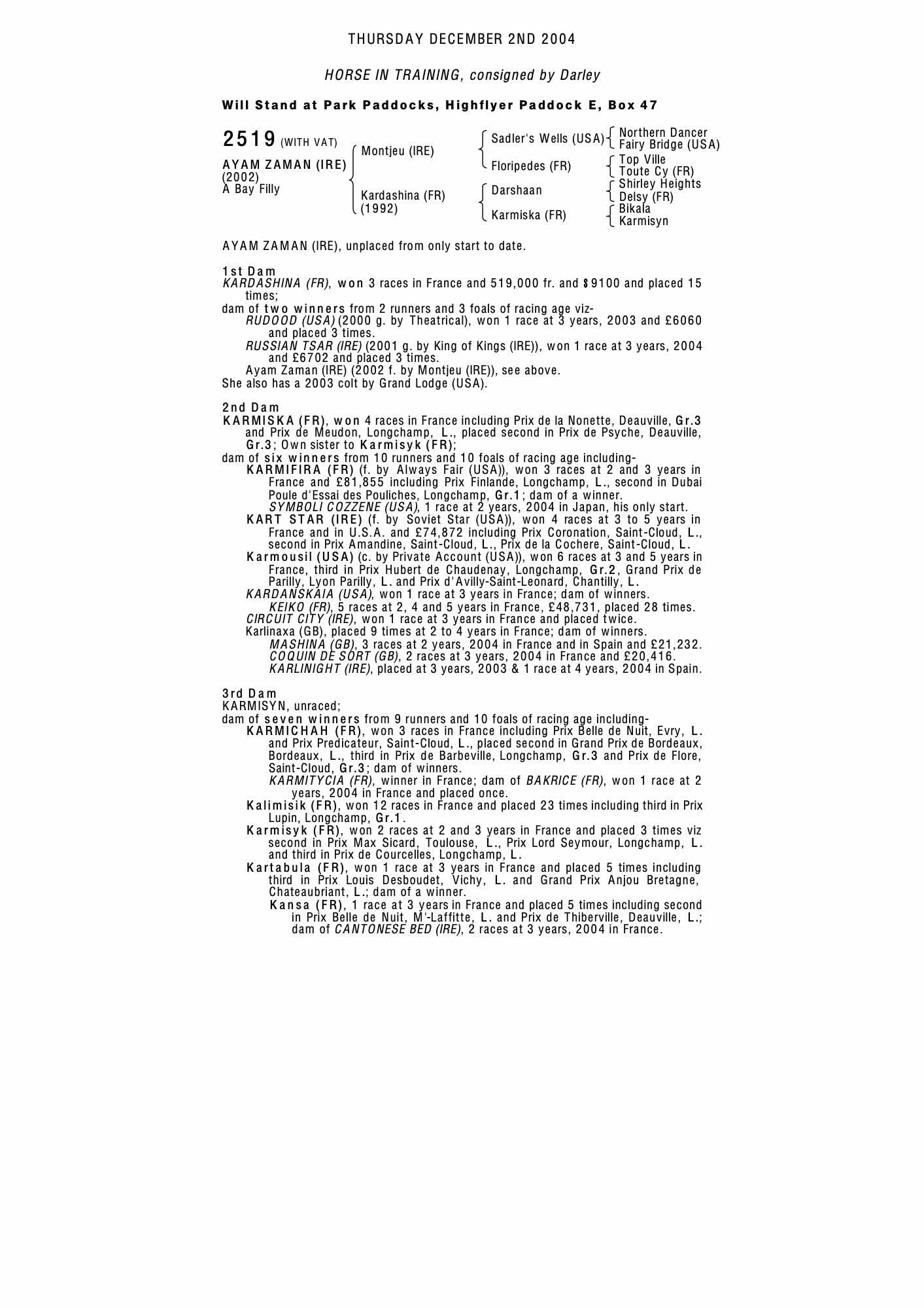 Houghton Yearling Sale 2001 lot 75 C. by Theatrical , Lynn Lodge Stud, Ireland (Agent)=>Shadwell Estate Company 220,000 gns