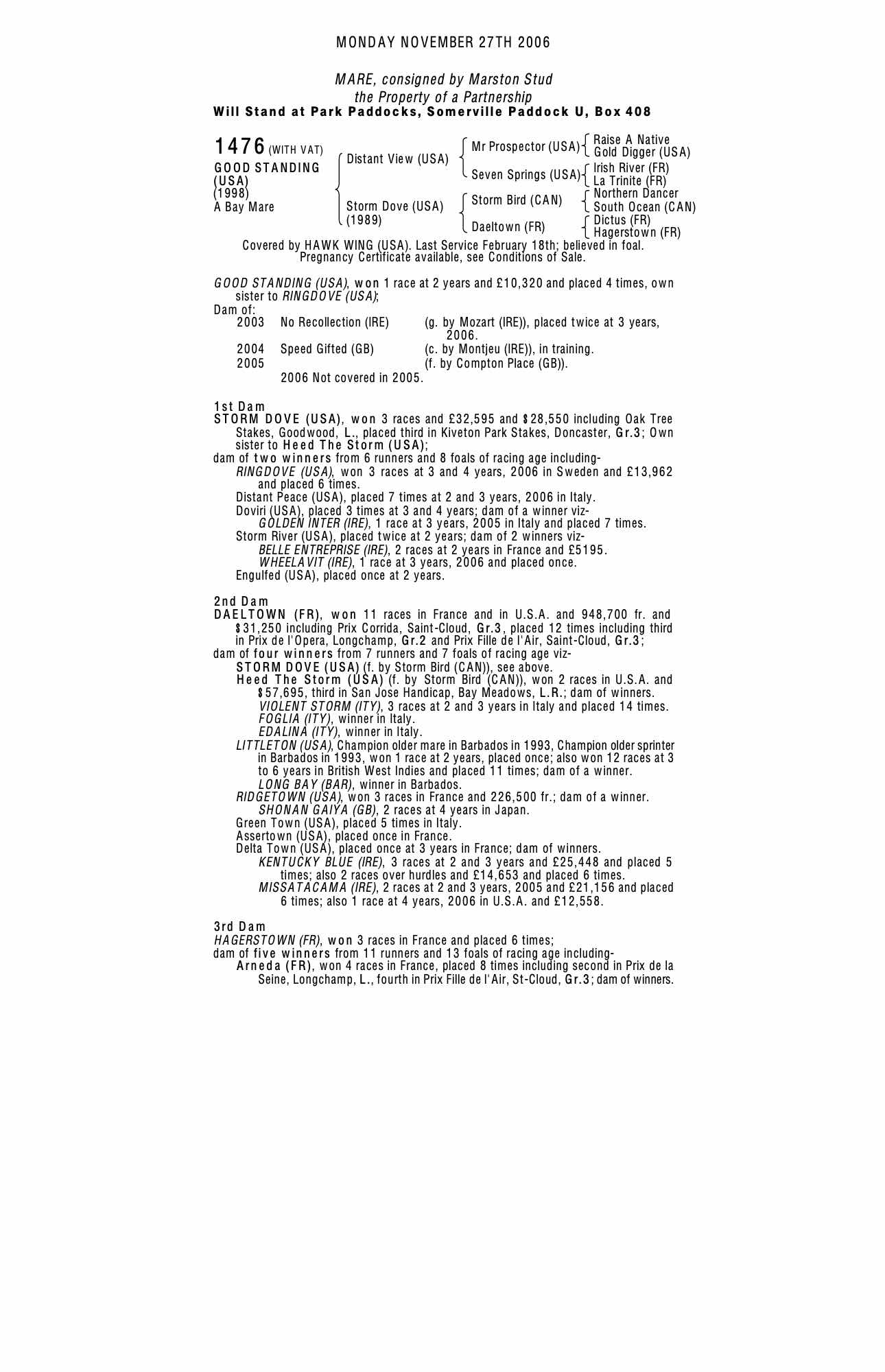 December Mare Sale 2001 lot 1611 Good Standing (USA) (F.), Juddmonte Farms=>BBA Ireland 16,000 gns