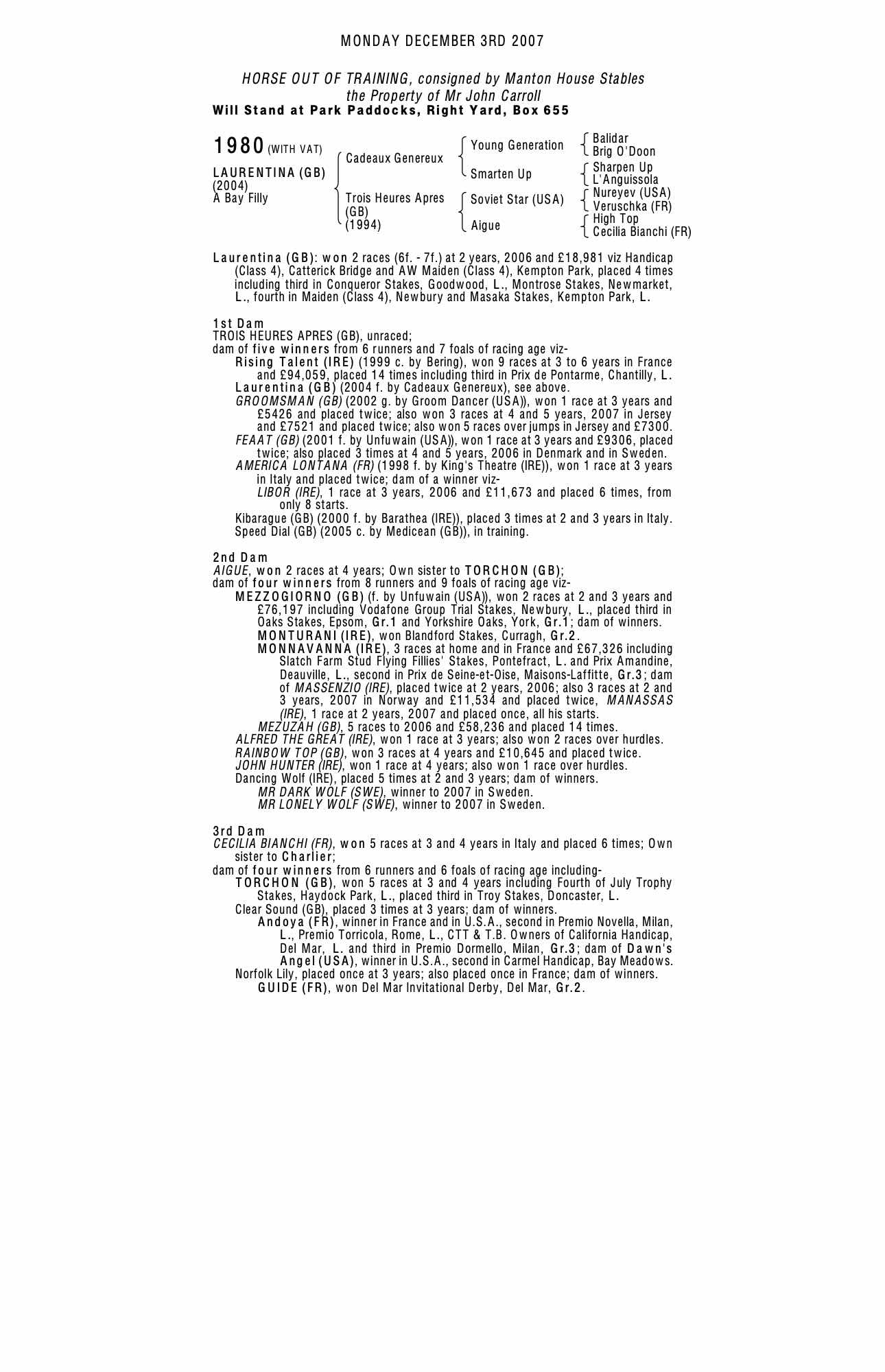 July Sale 2011 lot 729 Carsulae (IRE) (F. by Marju (IRE)), Bedford House Stables (L. Cumani)=>Lot Not Sold