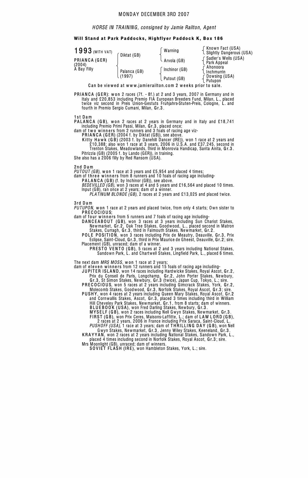 December Foal Sale 2003 lot 988 F. by Danehill Dancer (IRE) 2003, Castletown Stud, Ireland (Agent)=>Tom Magnier 70,000 gns