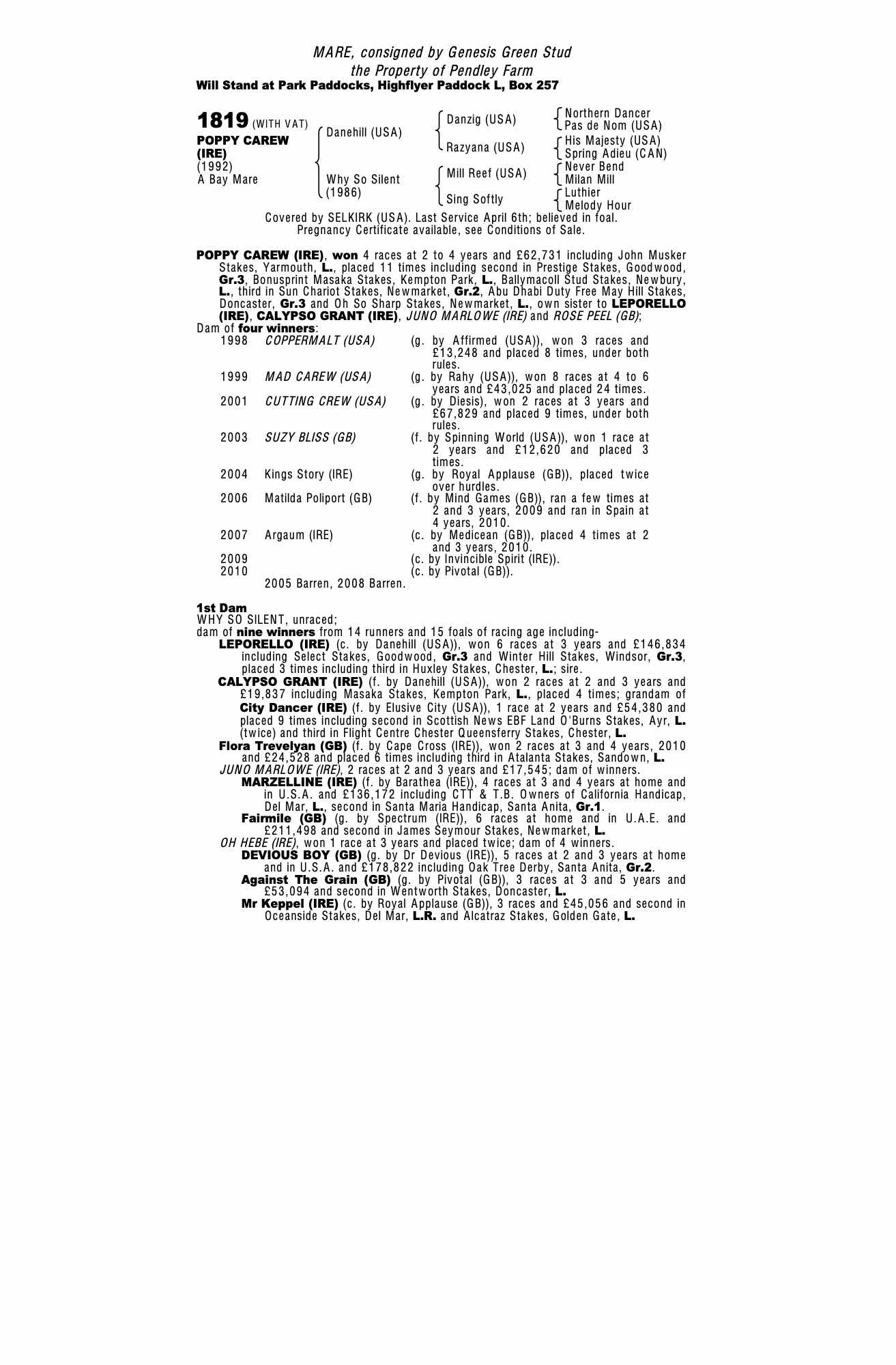 December Mare Sale 2010 lot 1822 Suzy Bliss (GB) (M. by Spinning World (USA)), Genesis Green Stud=>Emerald Bloodstock 10,000 gns