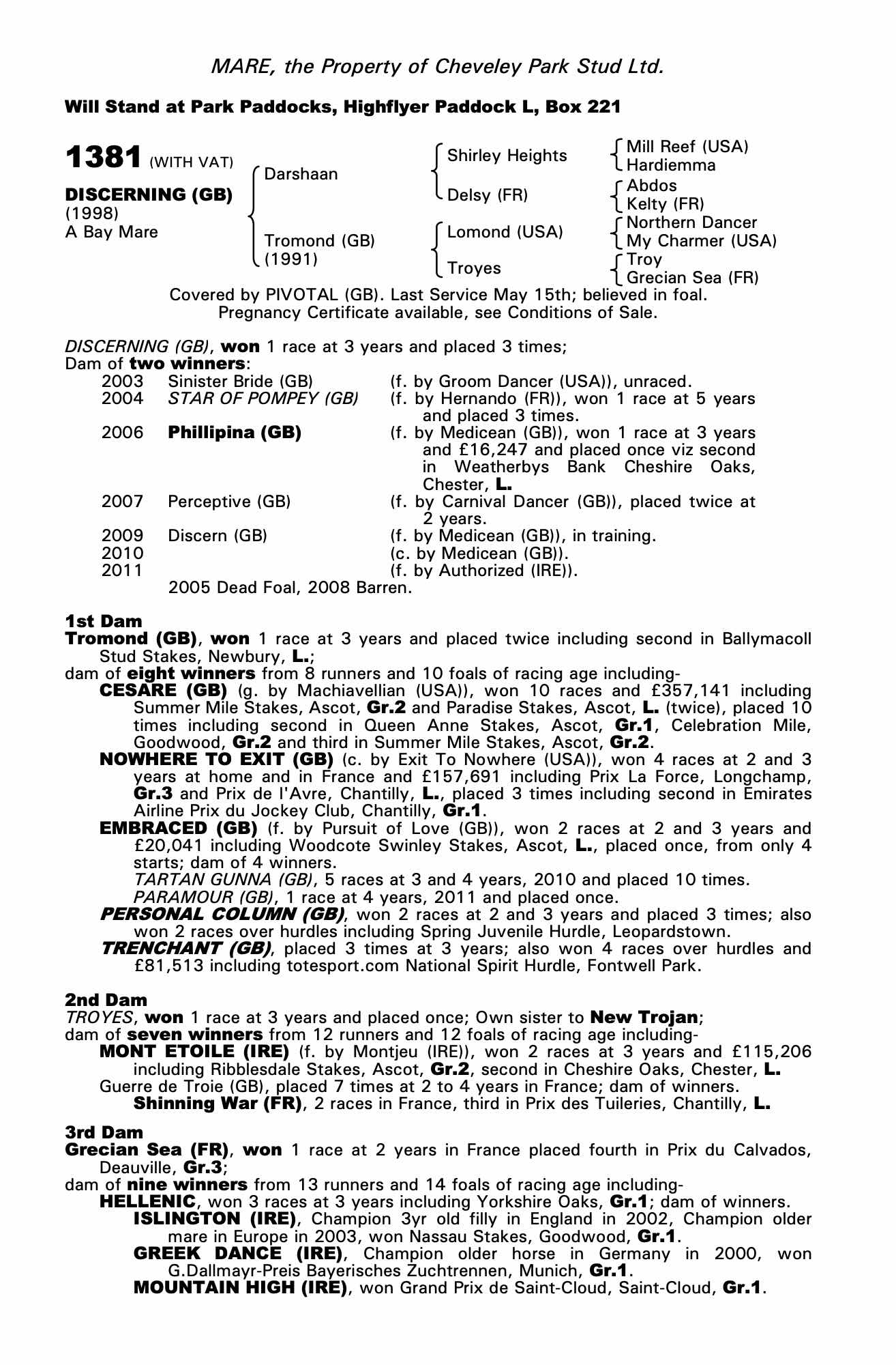 December Mare Sale 2011 lot 2053 Discern (GB) (F. by Medicean (GB)), Pegasus Stables (J. Fanshawe)=>Vendor 8,000 gns