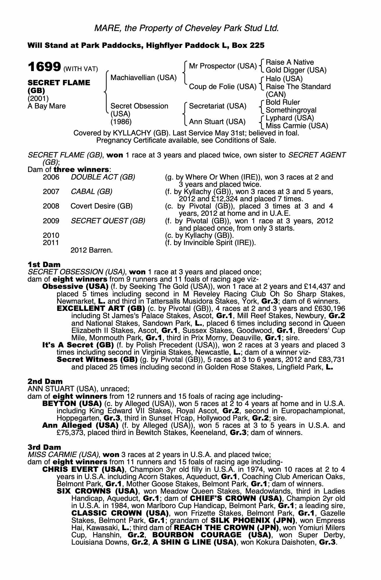 July Sale 1999 lot 183 Secret's Out (GB) (C. by Polish Precedent (USA)), Freemason Lodge=>John Quinn 26,000 gns