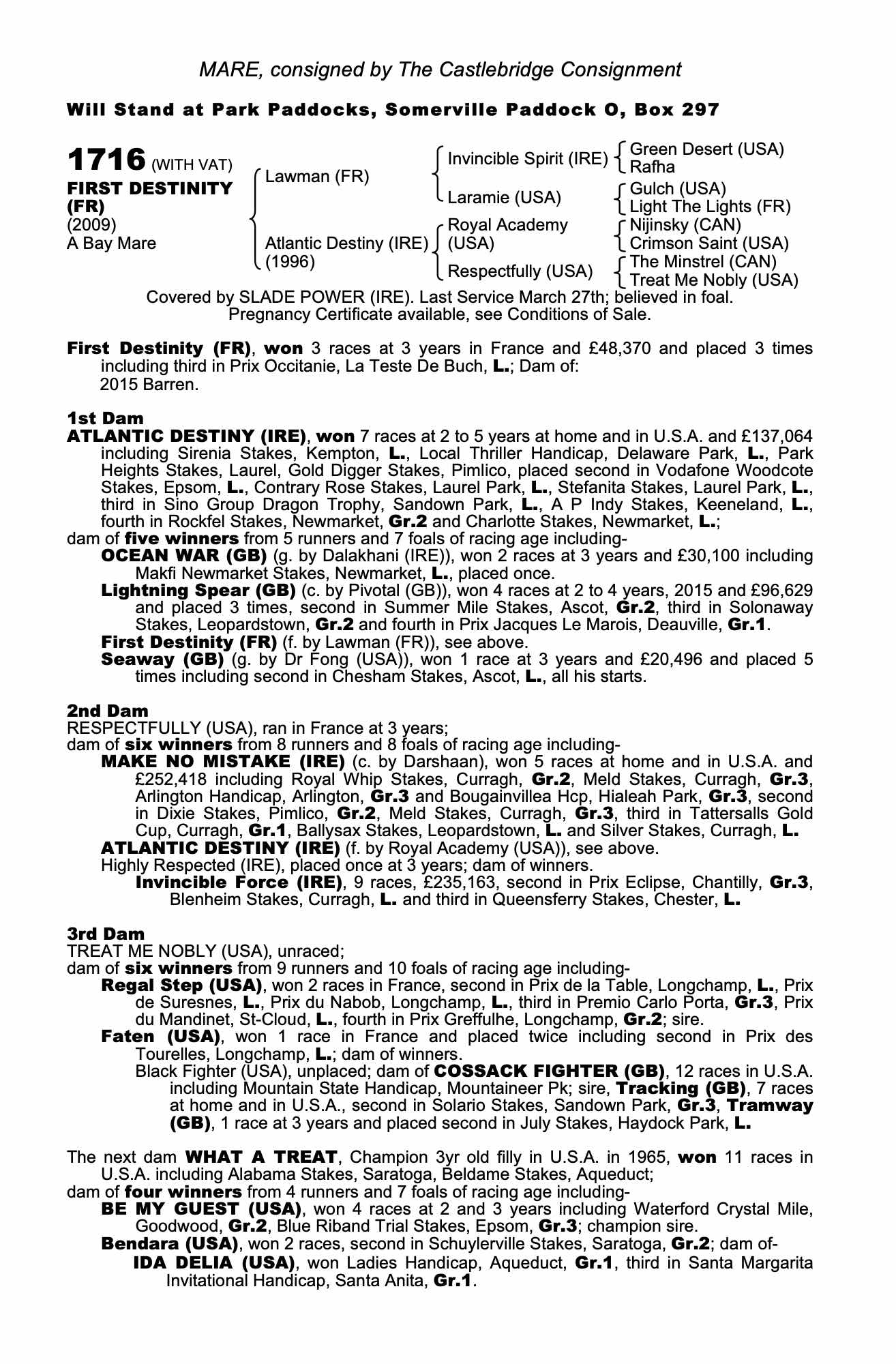Online Charity Auction of Stallion Nominations lot 35 A Nomination to Lightning Spear (GB) (H. by Pivotal (GB)), =>Bidding Closed £4,000