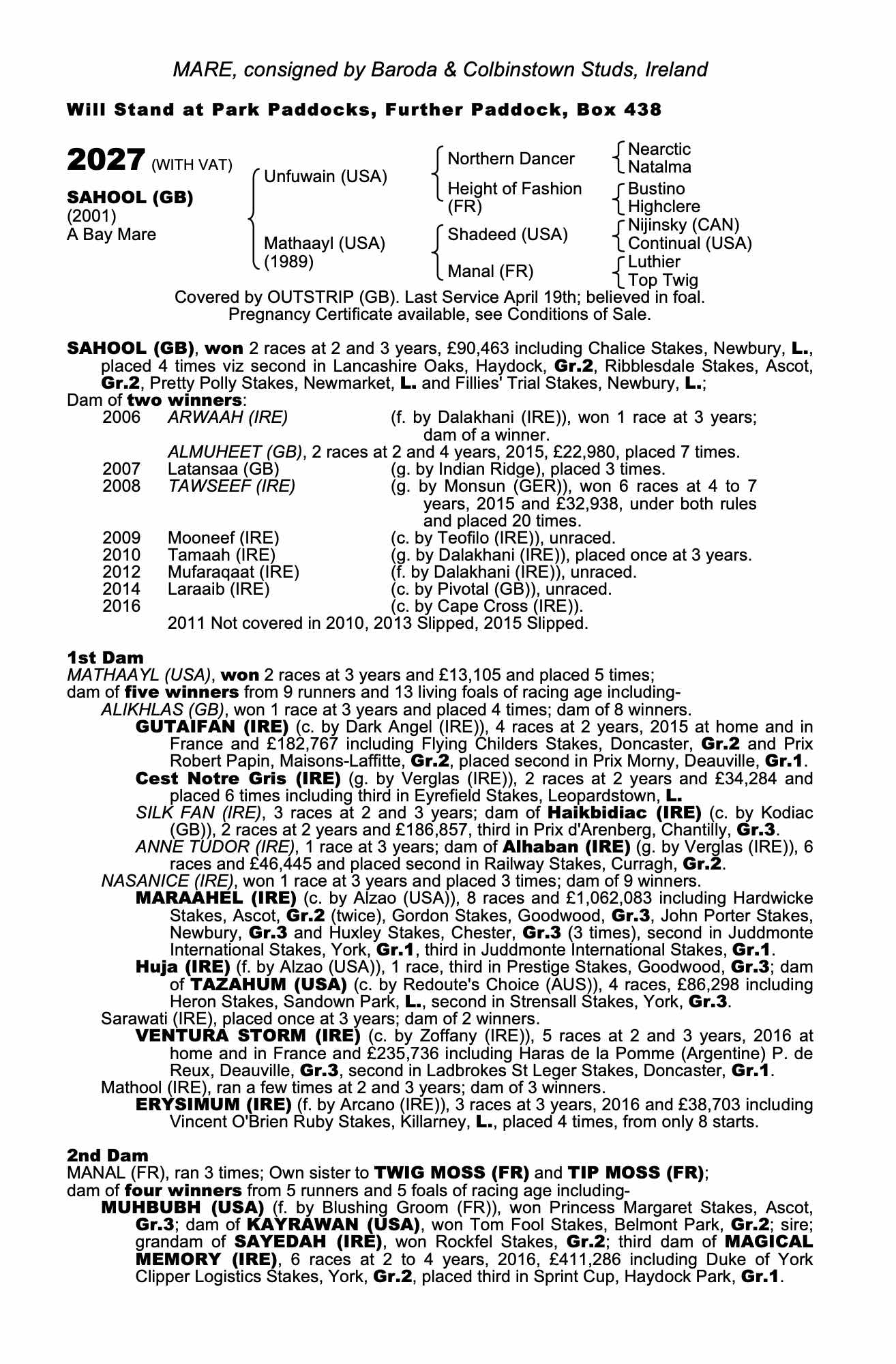 October Yearling Sale 2002 lot 47 F. 2001, Rathbarry Stud, Ireland=>Shadwell Estate Company 180,000 gns