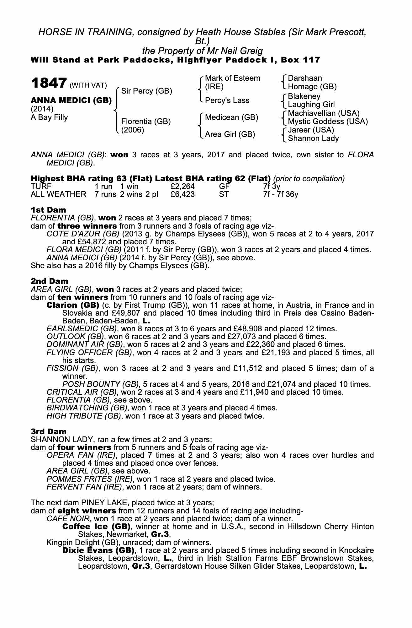 Monday 4 December: ANNA MEDICI (GB), won 4 races at 3 years, 2017 and £12,596 and placed 3 times: won 8f. AWT Handicap, Chelmsford and 2nd in 8f. AWT Handicap, Southwell.