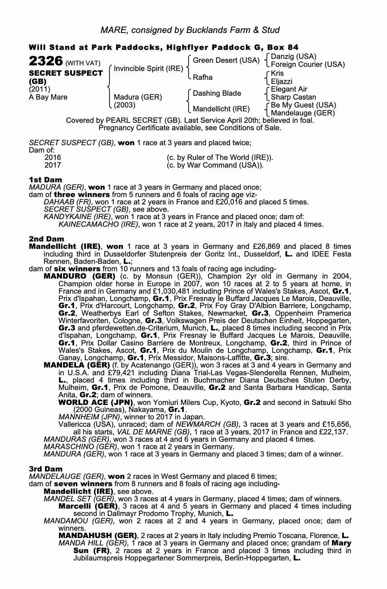 Monday 27 November:  2nd Dam Mandellicht (IRE); dam of seven winners including HIPSTER BOY (GB) (c. by Dubawi (IRE)), won 1 race at 2 years, 2017 and placed once, all starts to date.