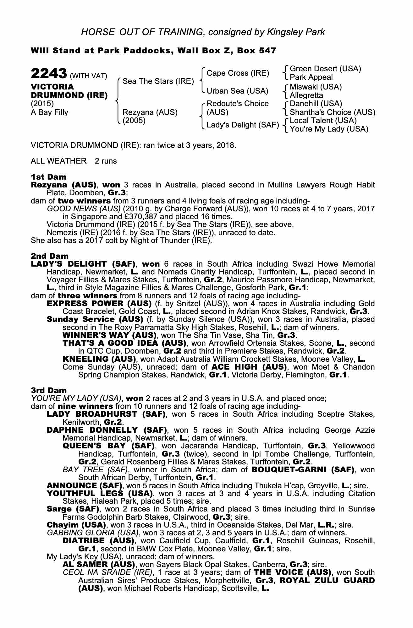 VICTORIA DRUMMOND (IRE), won 2 races at 3 years, 2018 viz 13f. AWT Novice Stakes (Class 5), Chelmsford and 12f. AWT Handicap (Class 4), Southwell. Highest BHA rating 91 (Flat) Latest BHA rating 89 (Flat)