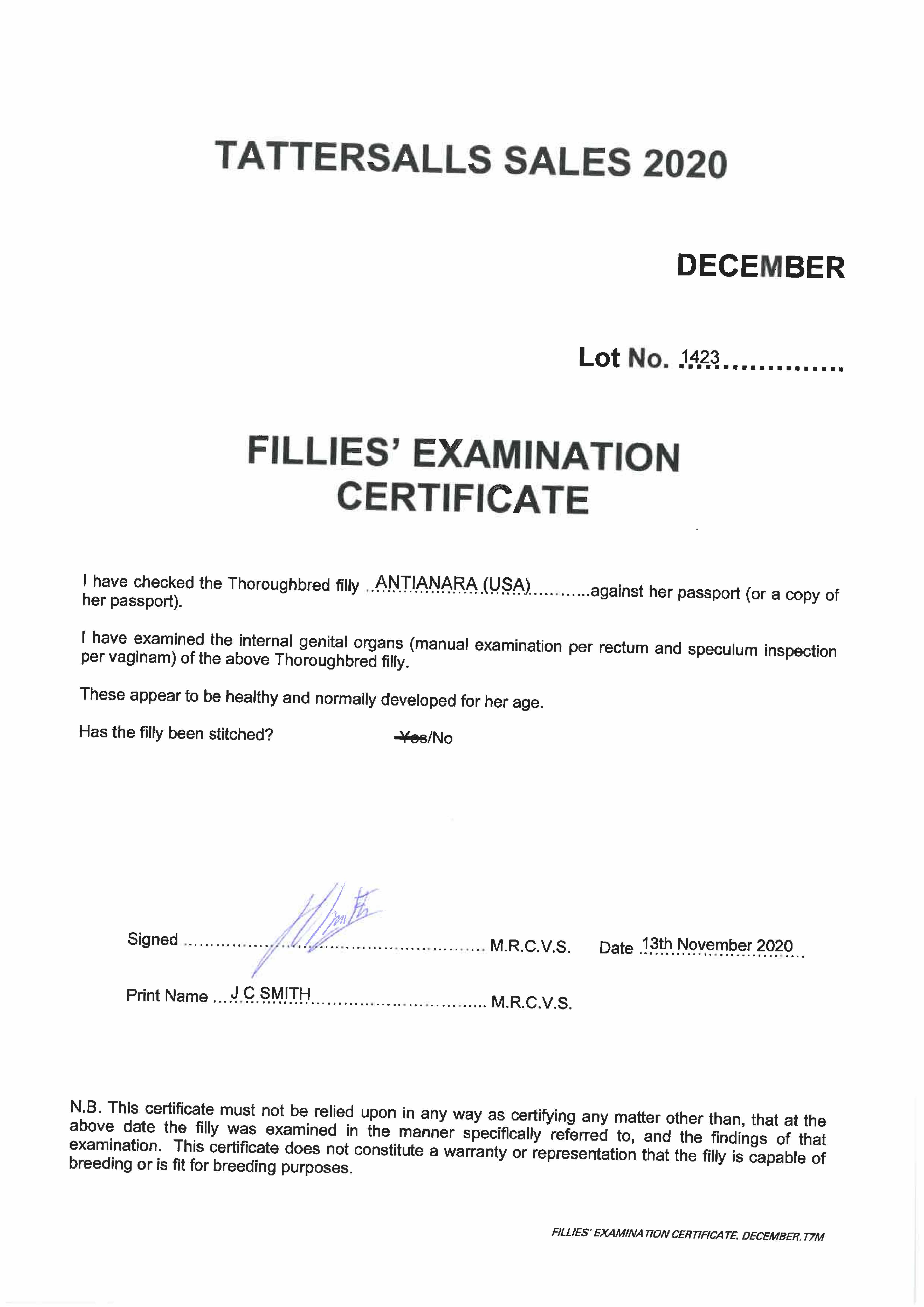 Fillies Examination Cert