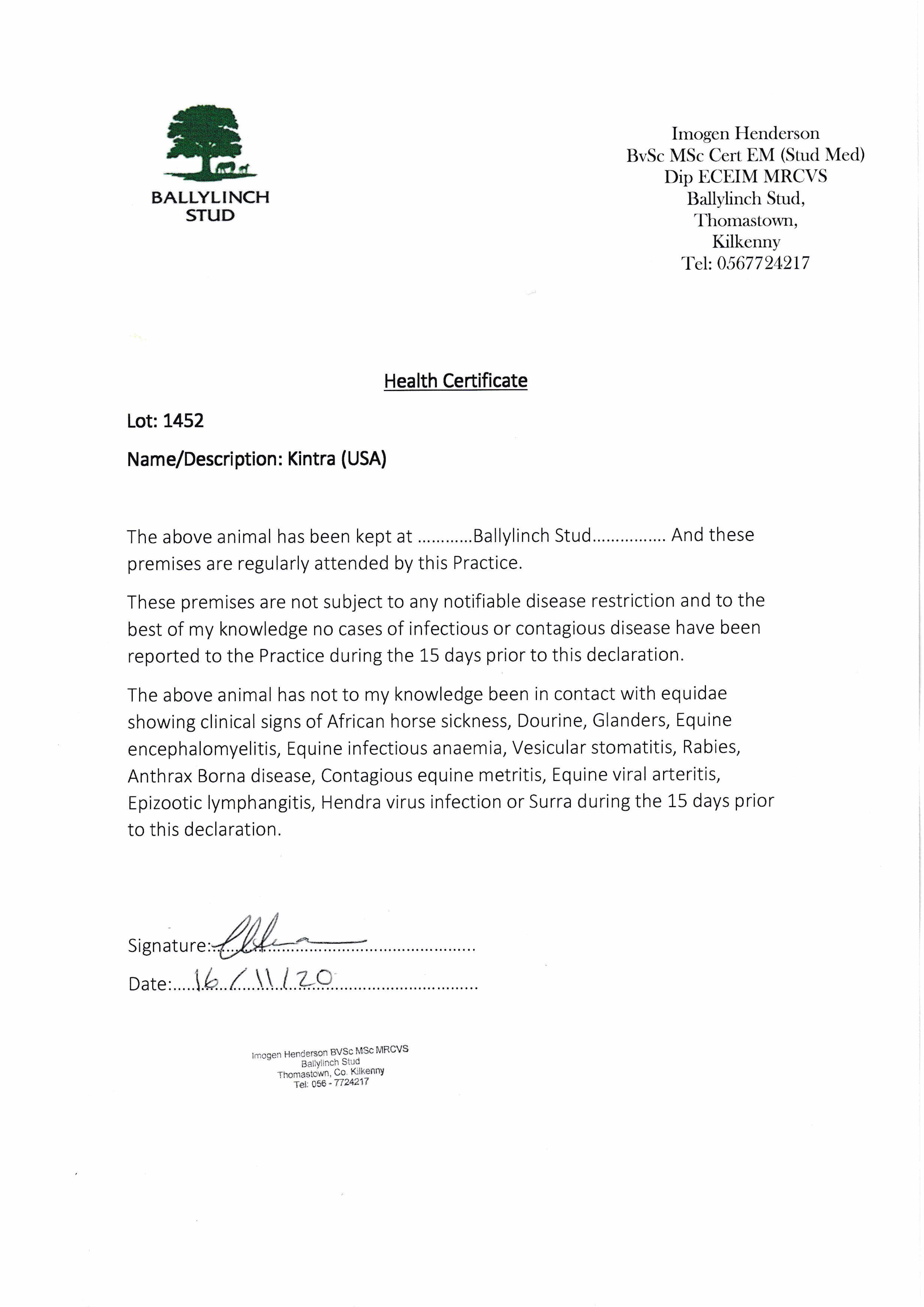Contact: Eoin Fives ✆ 00353 87 050 1888 ✉ eoin@ballylinchstud.ie