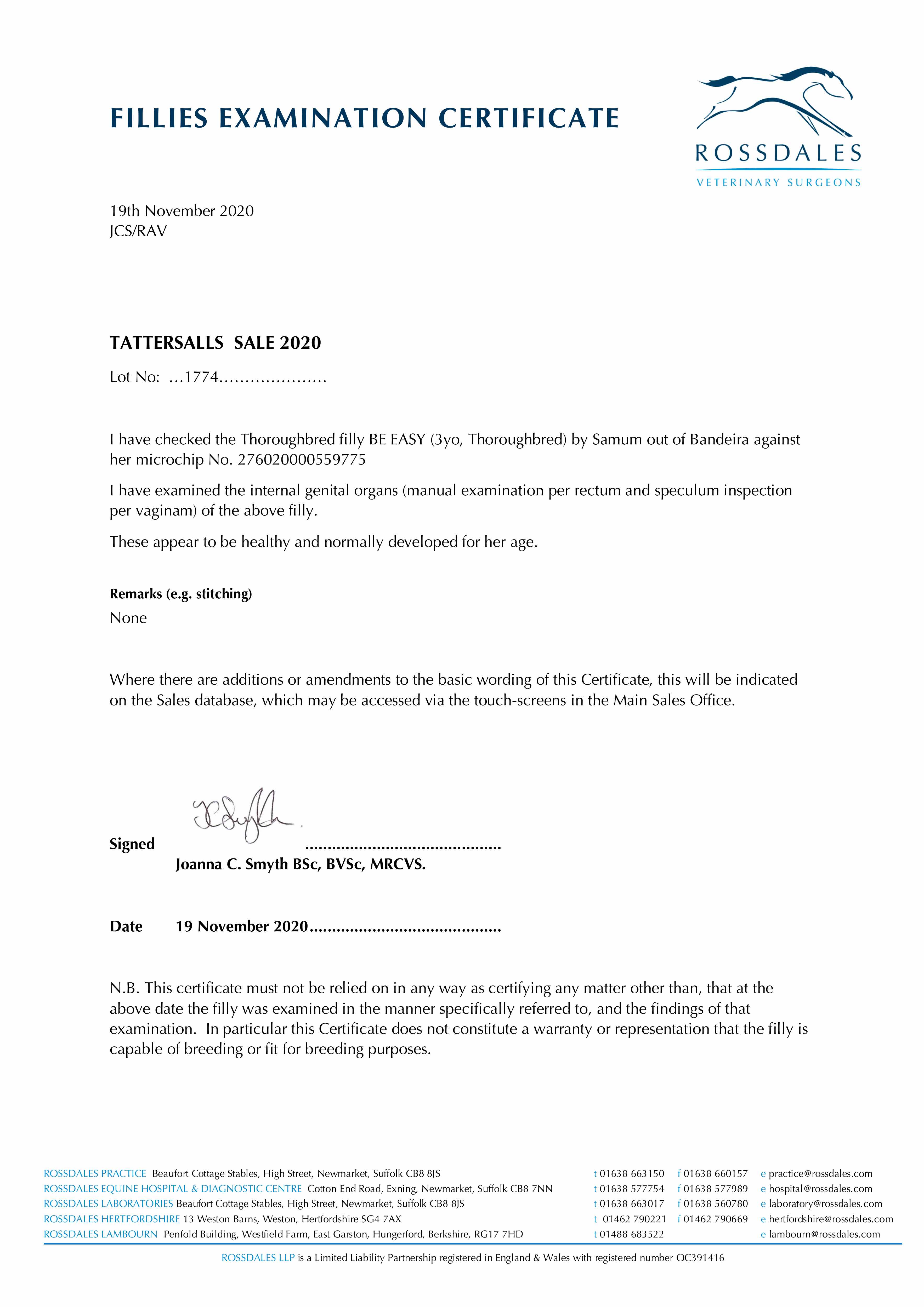 Fillies Examination Cert