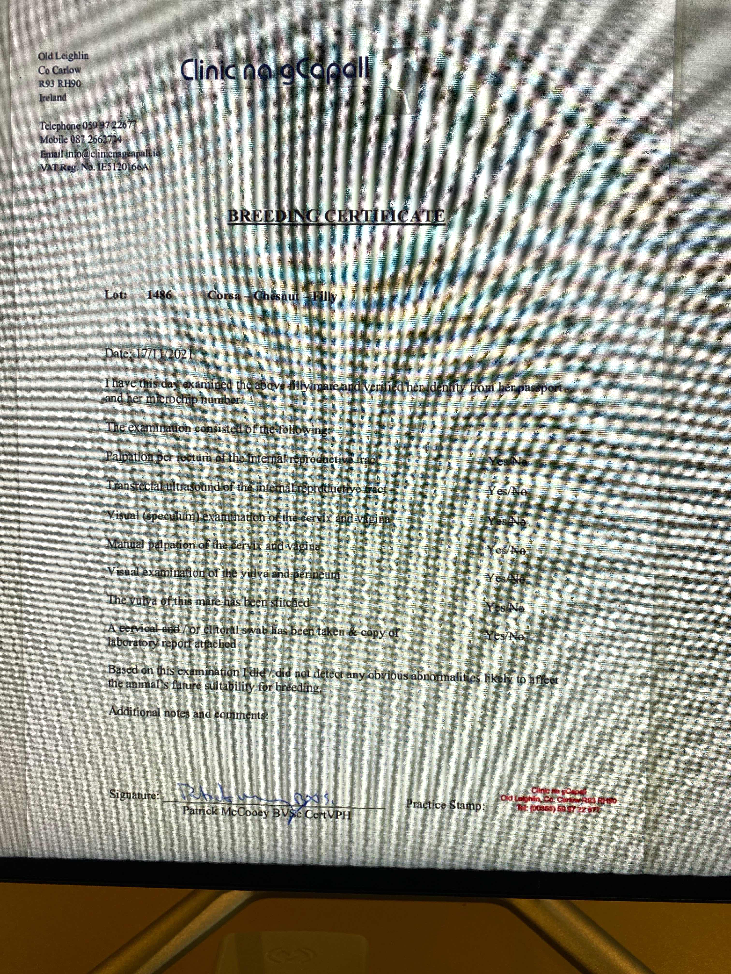 Fillies Examination Cert