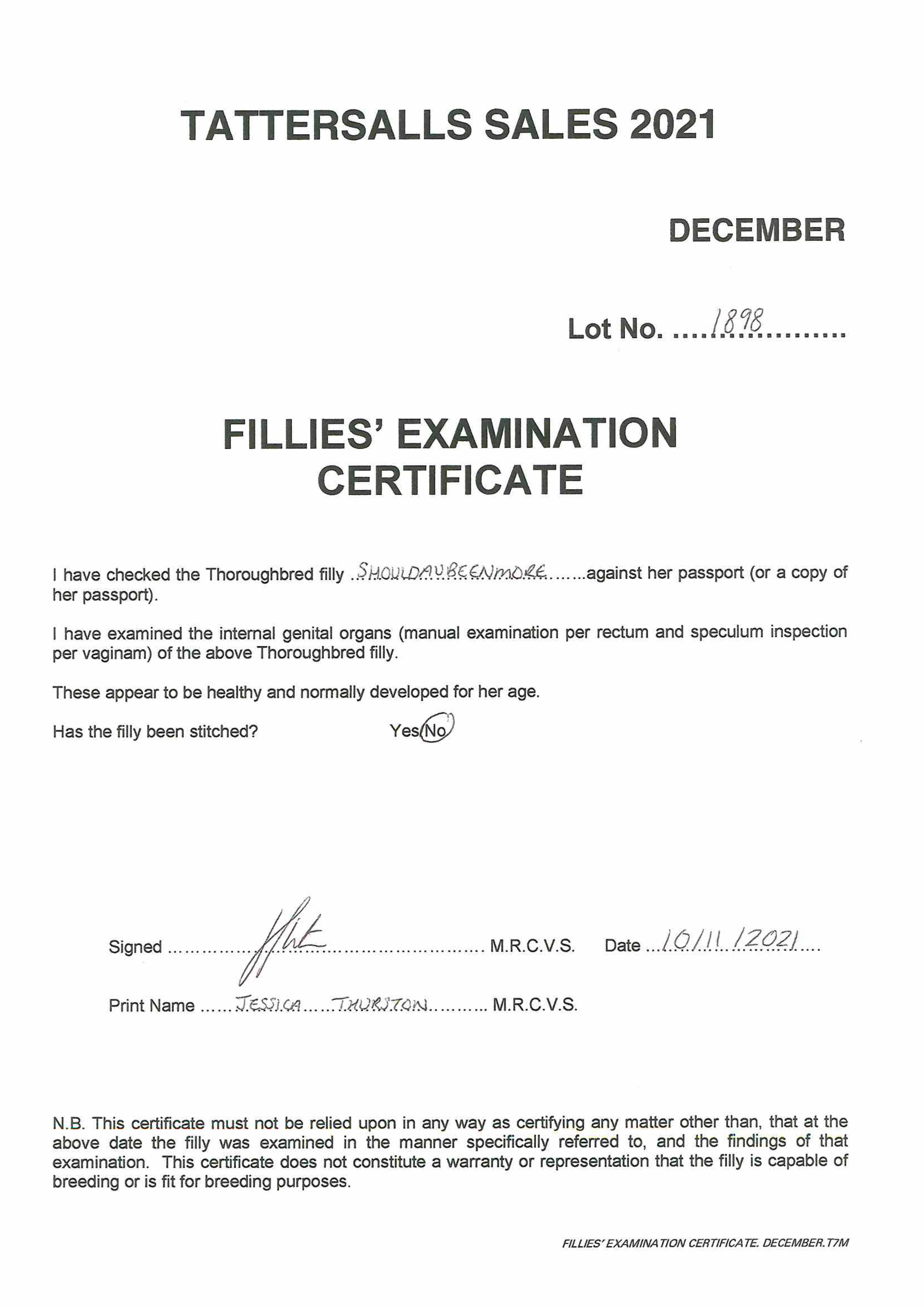 Fillies Examination Cert