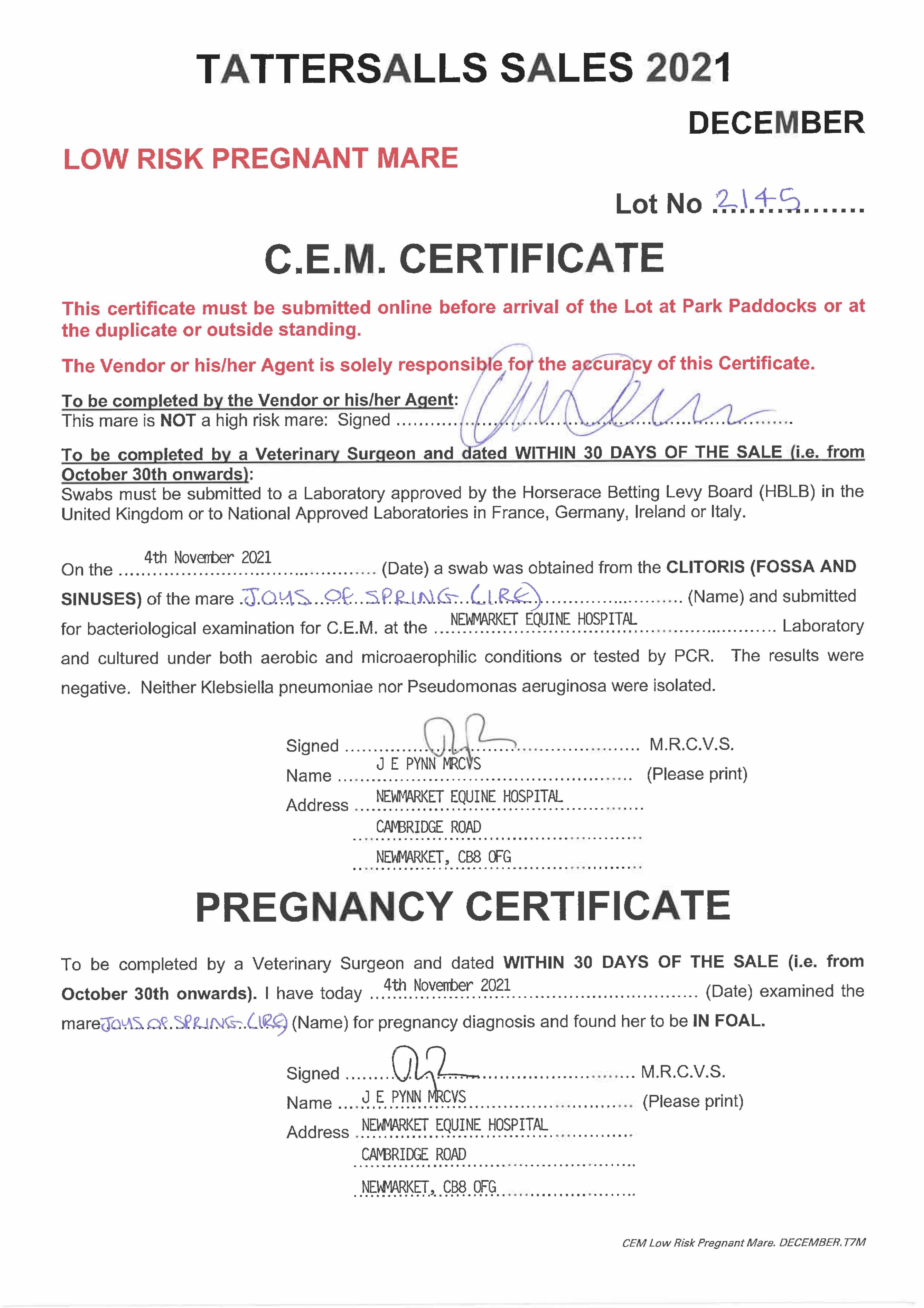 Online Sale - 21st November 2024 lot 108 Spring Chorus (GB) (F. by New Approach (IRE)), Mr Declan Levey=>Vendor 1,000 gns