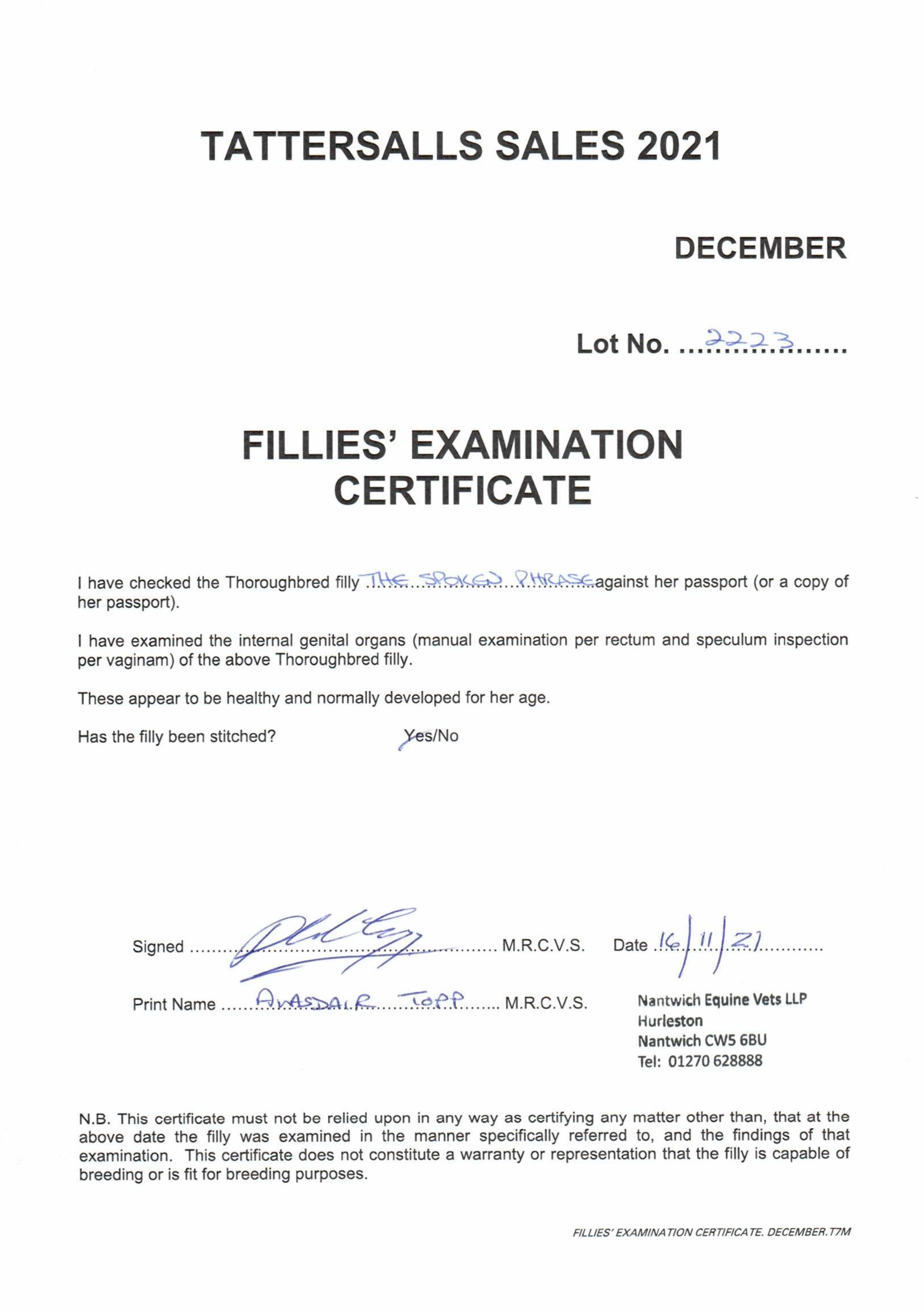 December Yearling Sale 2022 lot 144 F. by Time Test (GB) 2021, Brookside Stud (Newmarket)=>Vendor 1,000 gns