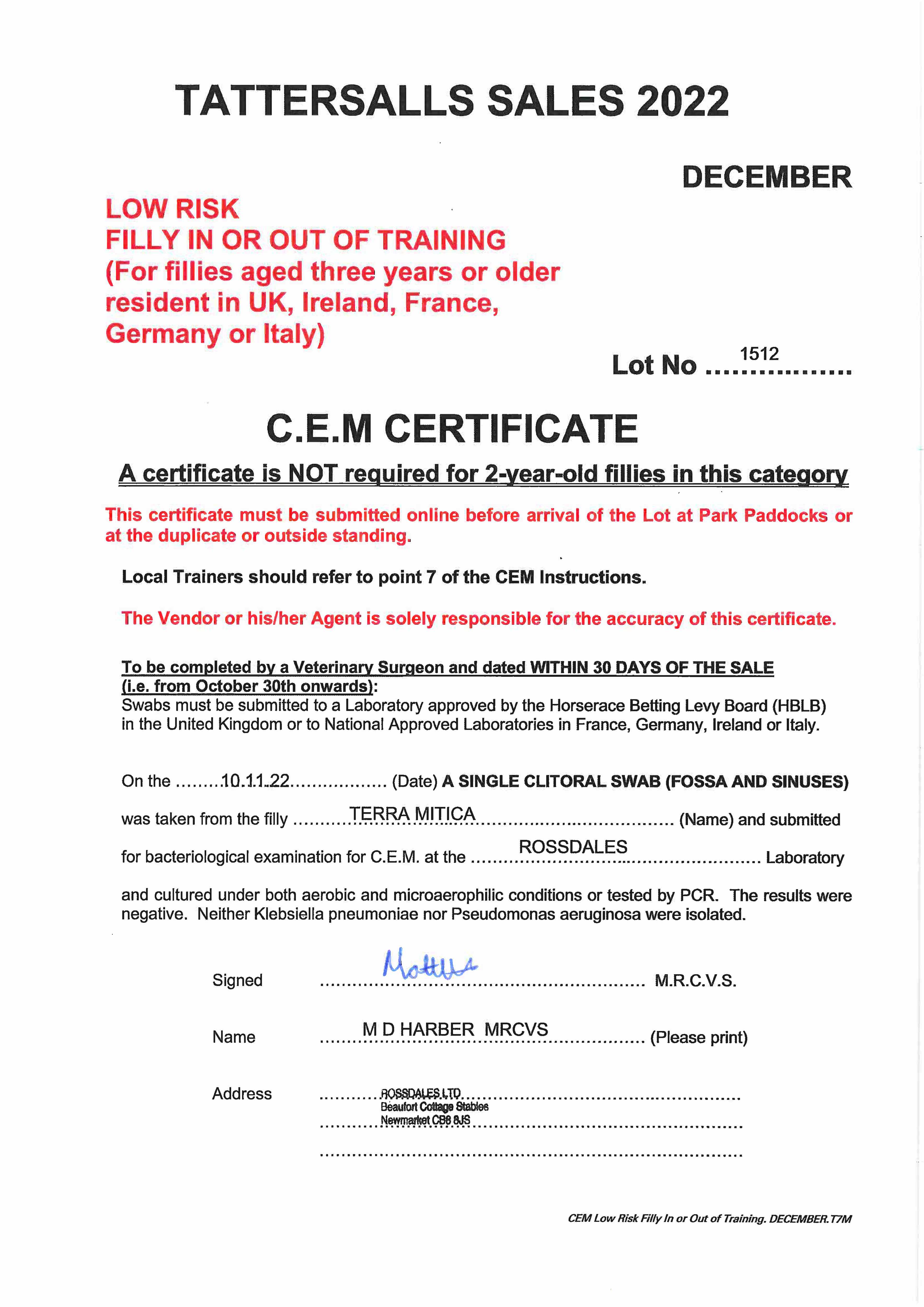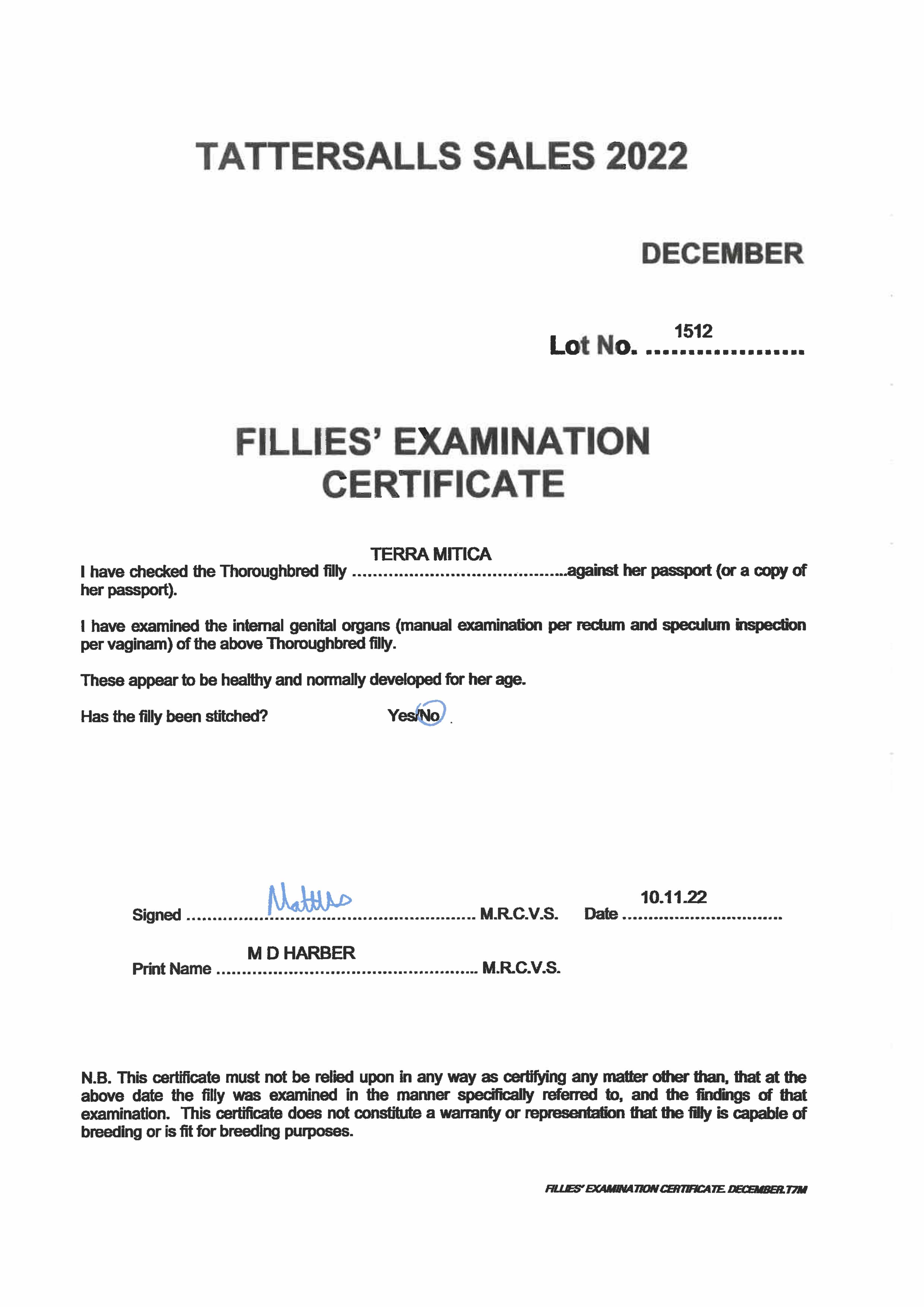Fillies Examination Cert