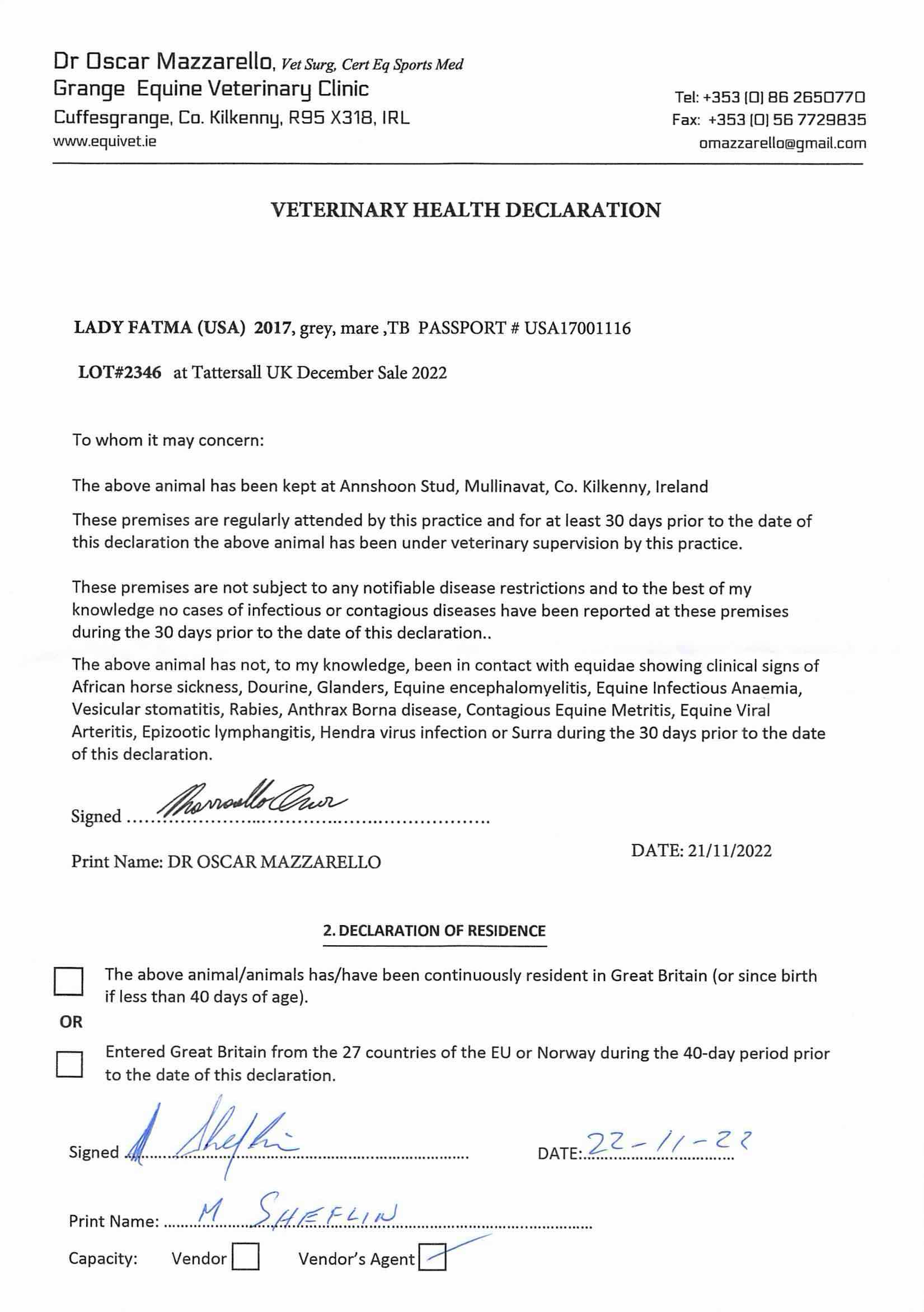 Online Sale - 12th December 2024 lot 82 F. by Arizona (IRE) 2023, Far Westfield Farm=>Vendor 20,000 gns