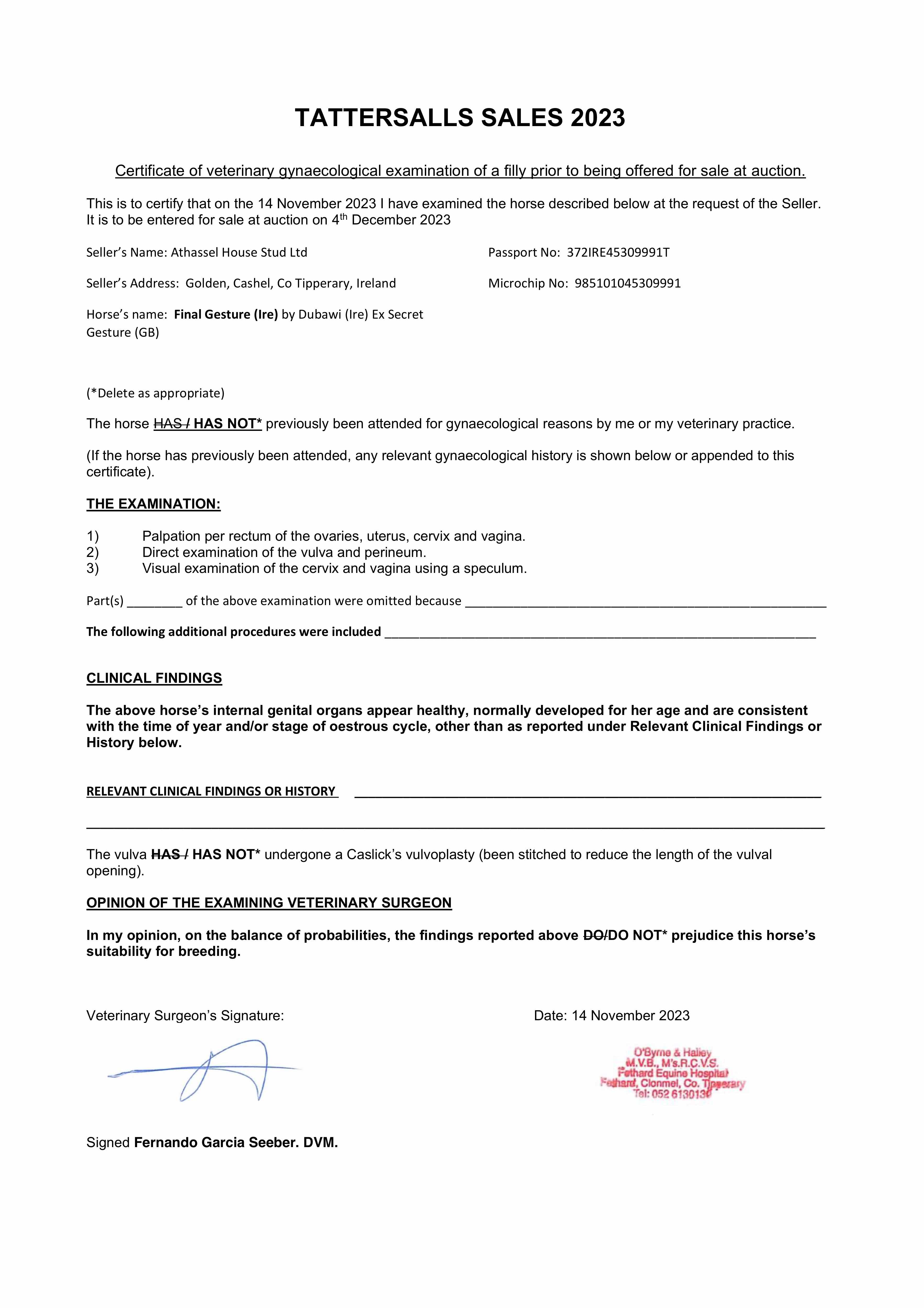 Fillies Examination Cert