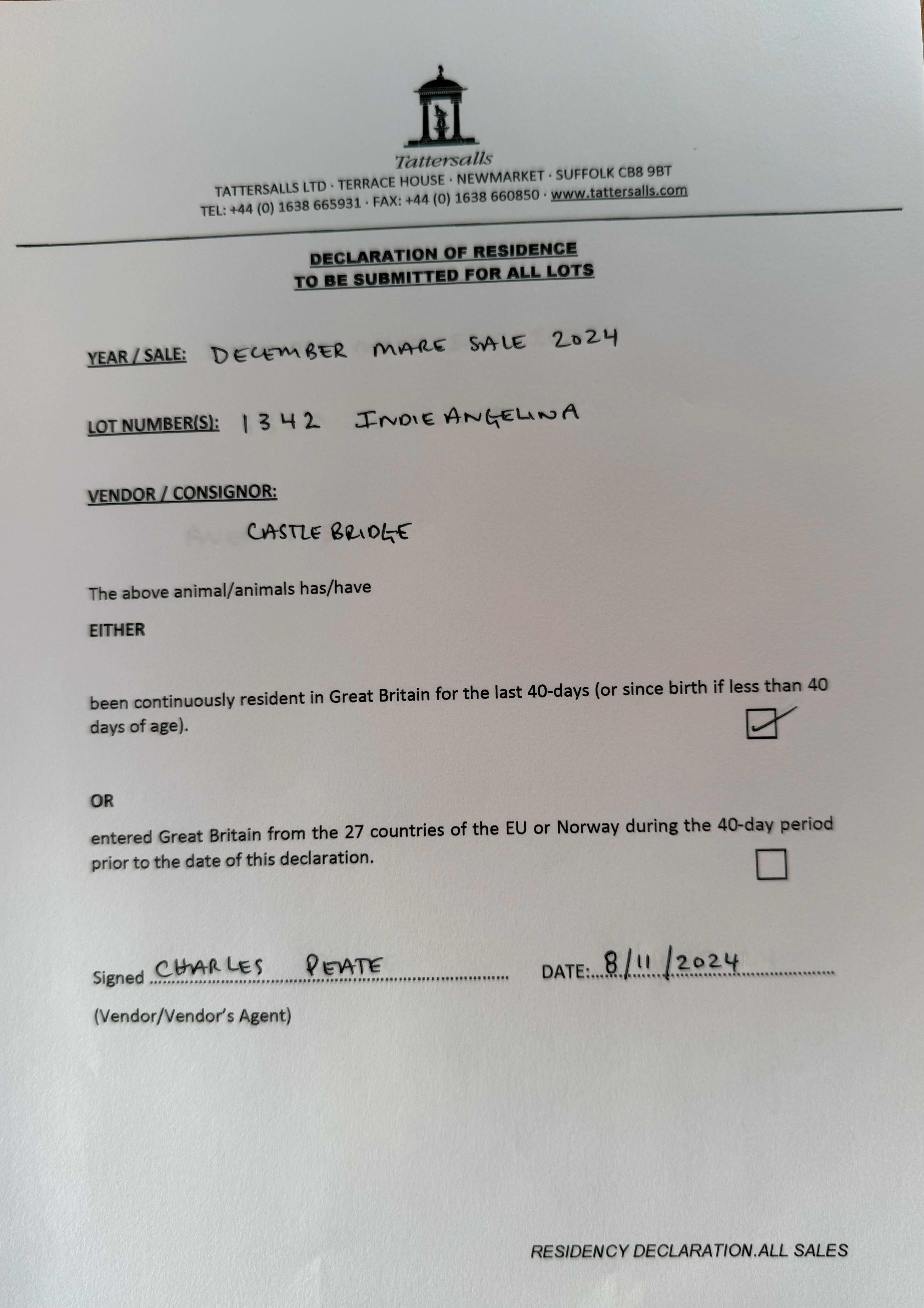 Online Sale - 23rd October 2025 lot 137, Ermyn Lodge Stud=>Vendor 5,000 gns