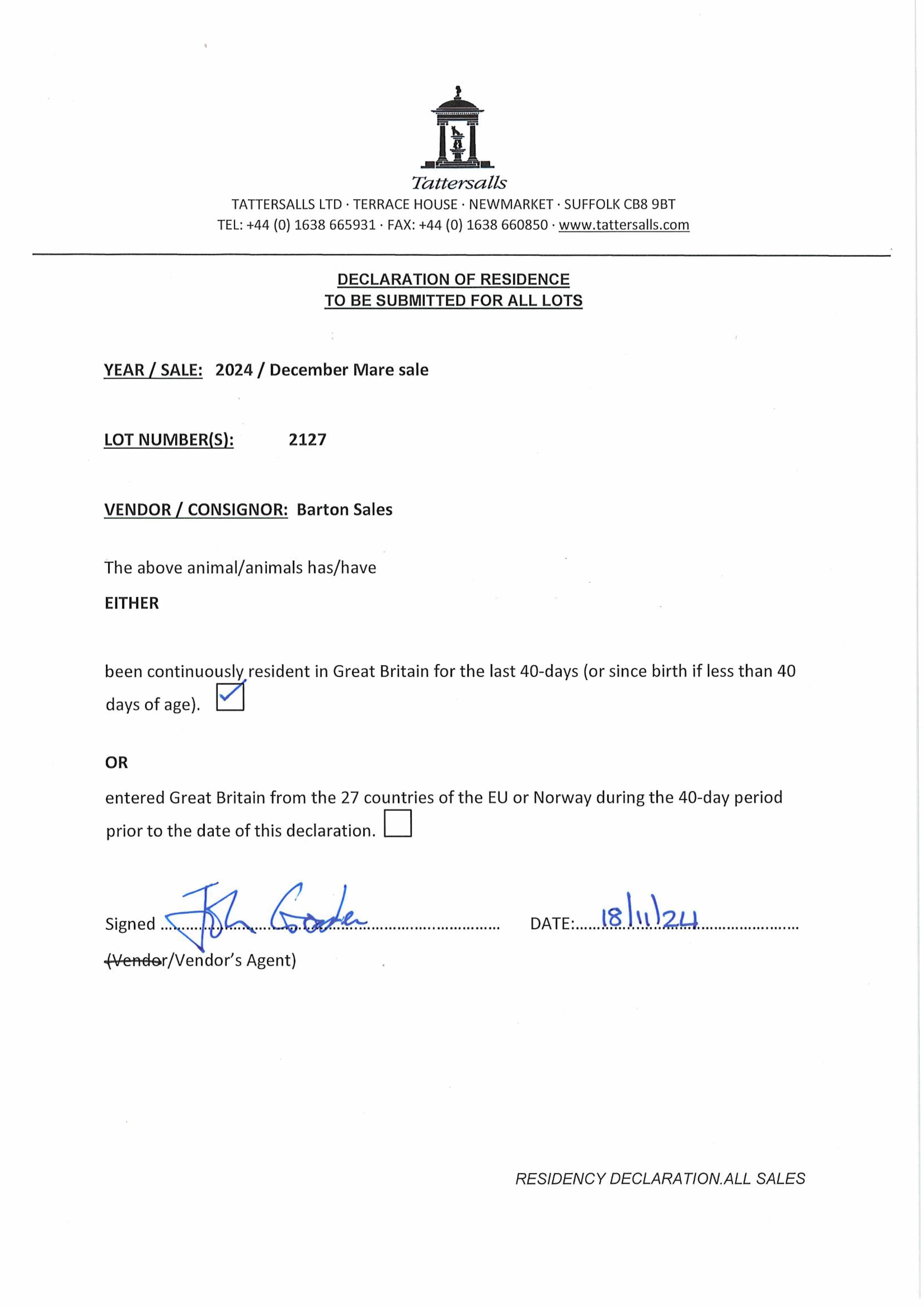 December Yearling Sale 2024 lot 99 F. by St Mark's Basilica (FR) 2023, Barton Stud=>Andrew Oliver 25,000 gns