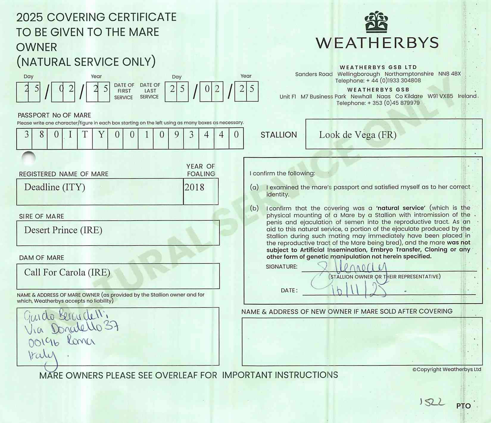Covering Certificate