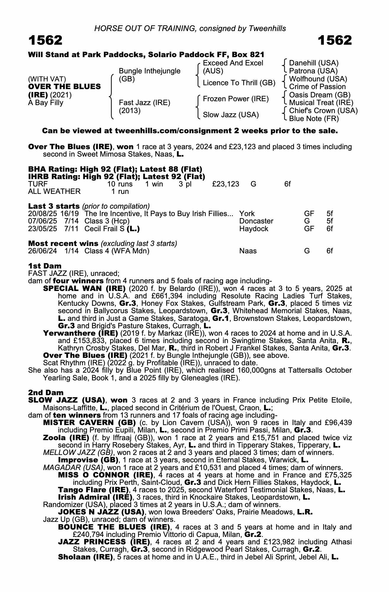 Half sister: SPECIAL WAN (IRE) (2020 f. by Belardo (IRE)), realised $1,300,000 at breeding stock sales, 2025.