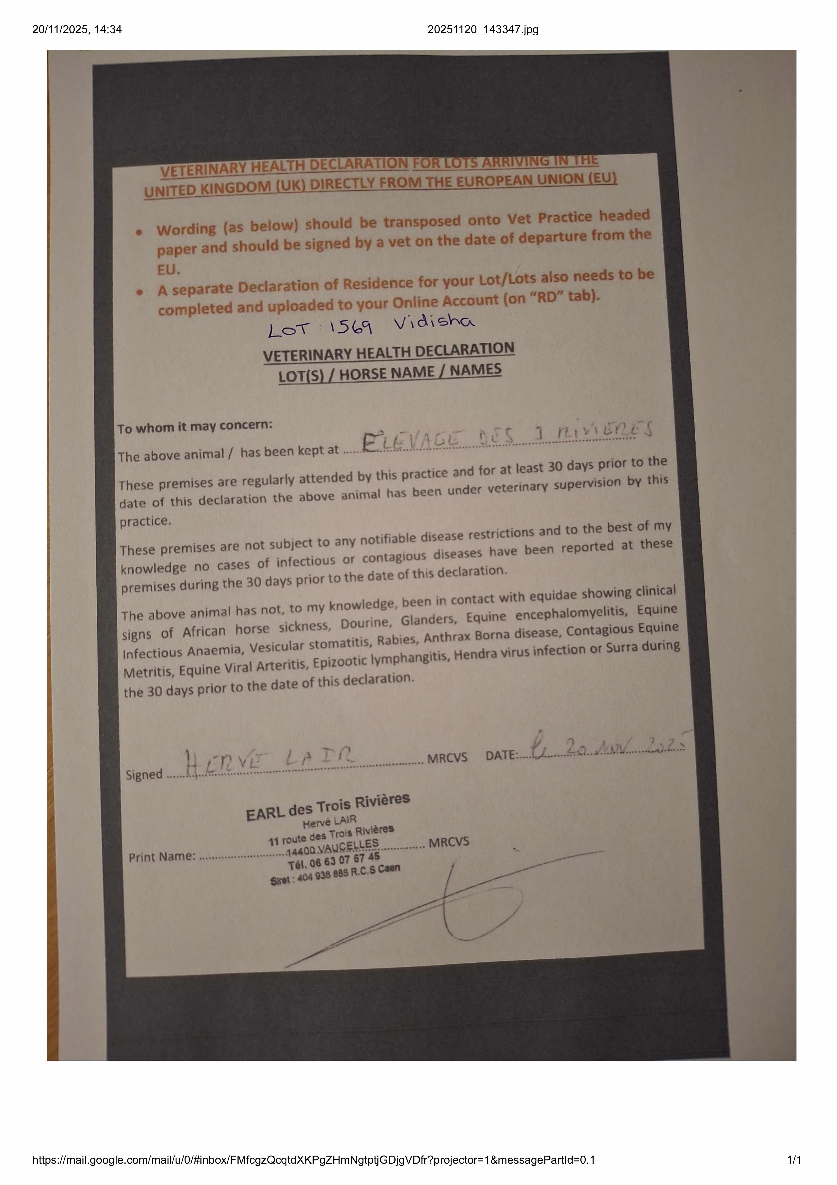 Official Veterinarian Declaration