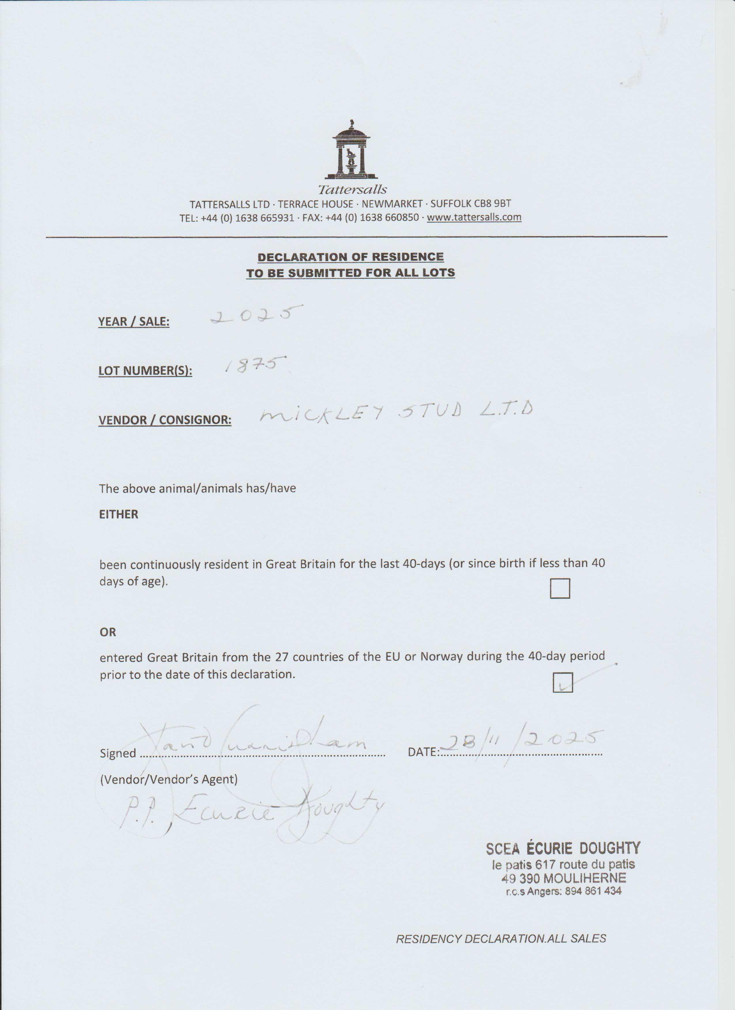 Consignor: Mickley Stud Ltd.