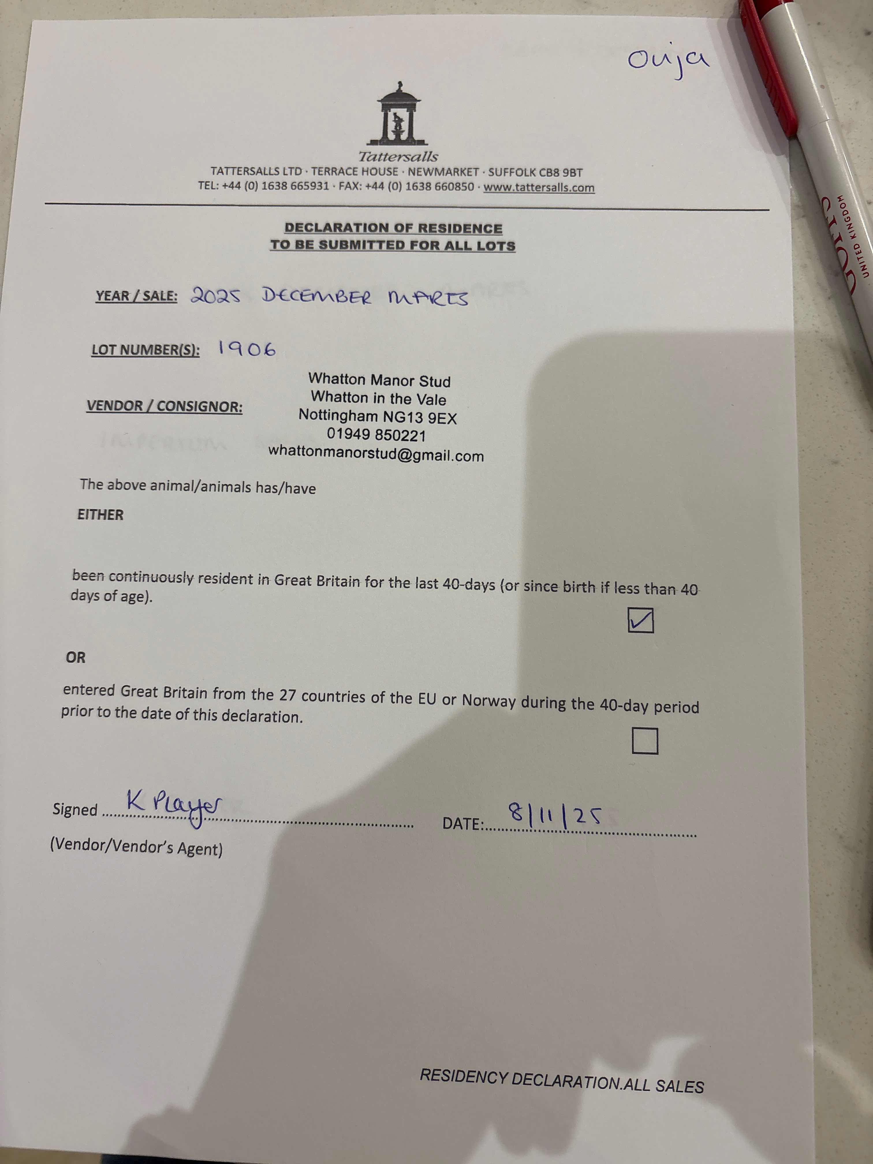 Consignor: Whatton Manor Stud