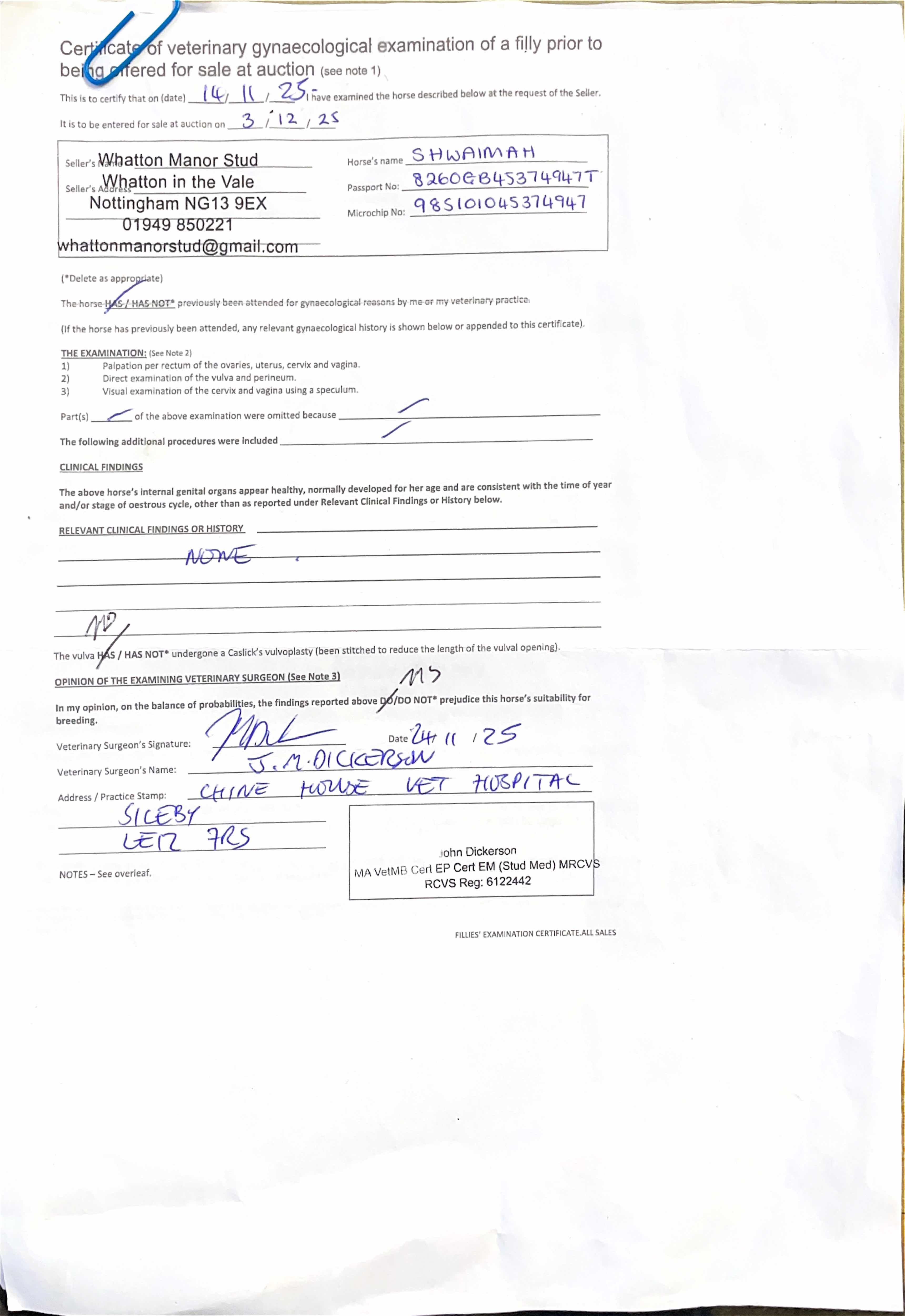 Consignor: Whatton Manor Stud