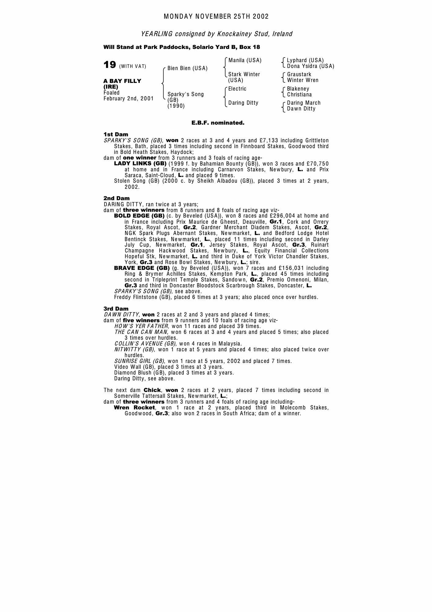 October Yearling Sale 2000 lot 1013 F. by Bahamian Bounty (GB) , Knockainey Stud, Ireland=>A Skiffington 22,000 gns