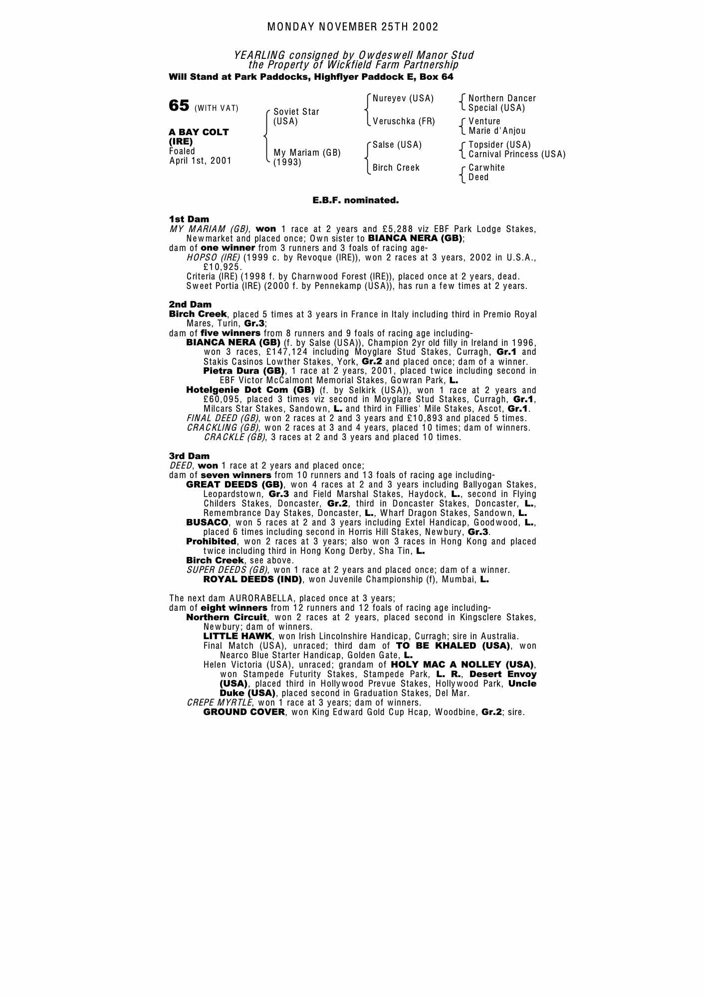 October Yearling Sale 2001 lot 447 F. by Pennekamp (USA) , Owdeswell Manor Stud=>Lot Not Sold 4,500 gns