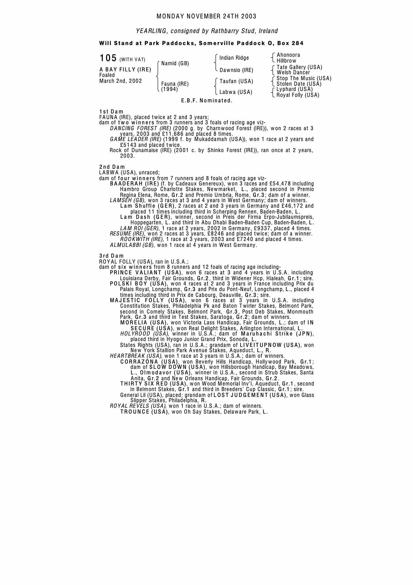 September Yearling Sale 2004 lot 109 C. by Indian Lodge (IRE) 2003, Rathbarry Stud=>Roger Fisher €24,000