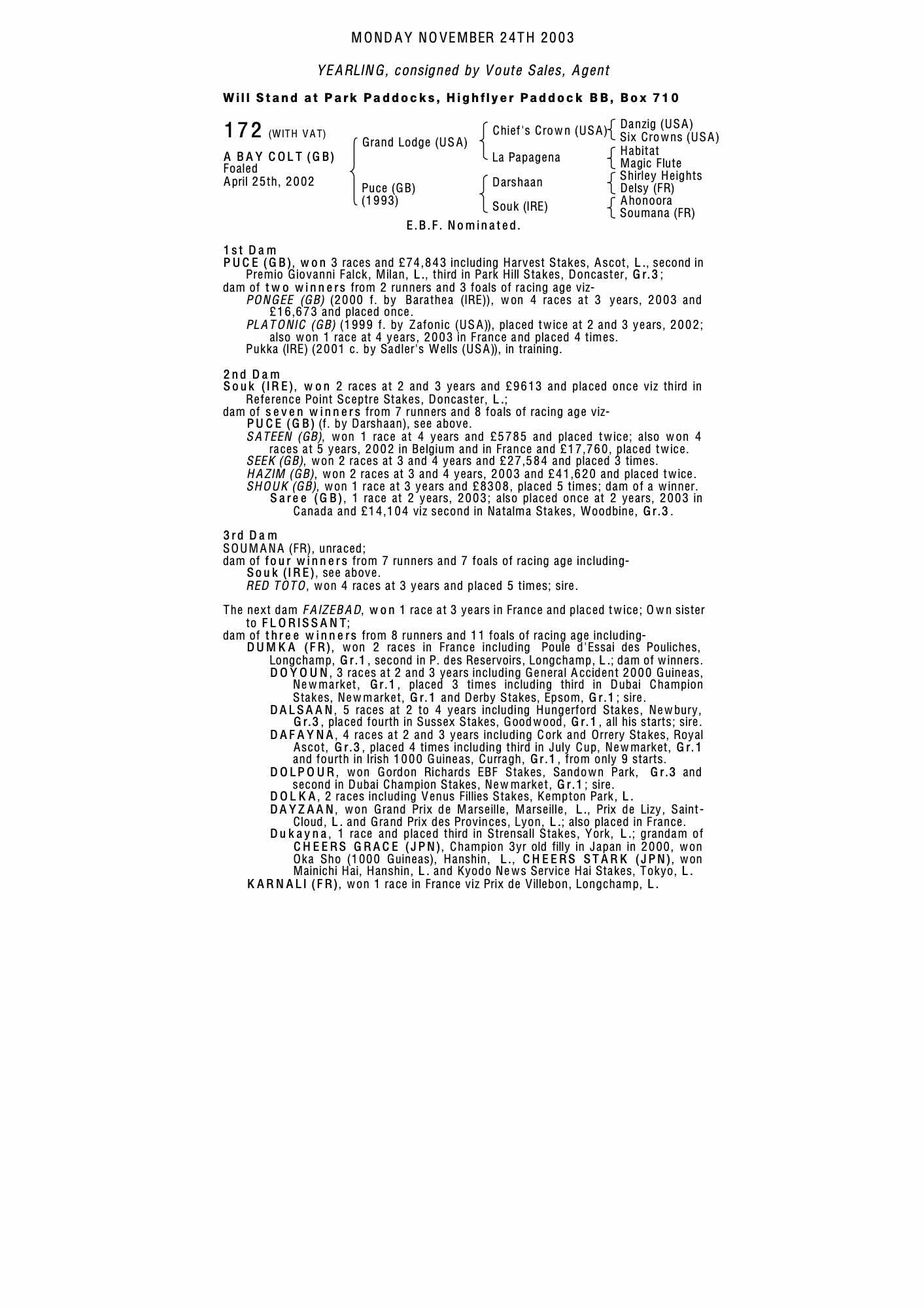 Houghton Yearling Sale 2002 lot 67 C. by Sadler's Wells (USA) 2001, Bugley Stud=>Vendor 80,000 gns