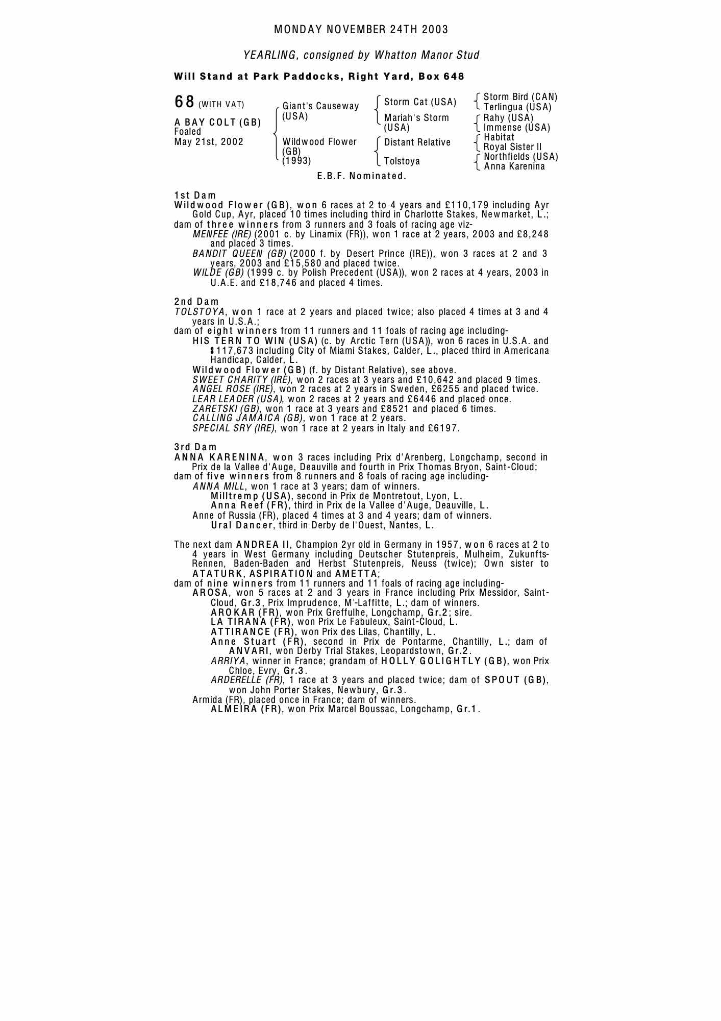 Consignor: Whatton Manor Stud