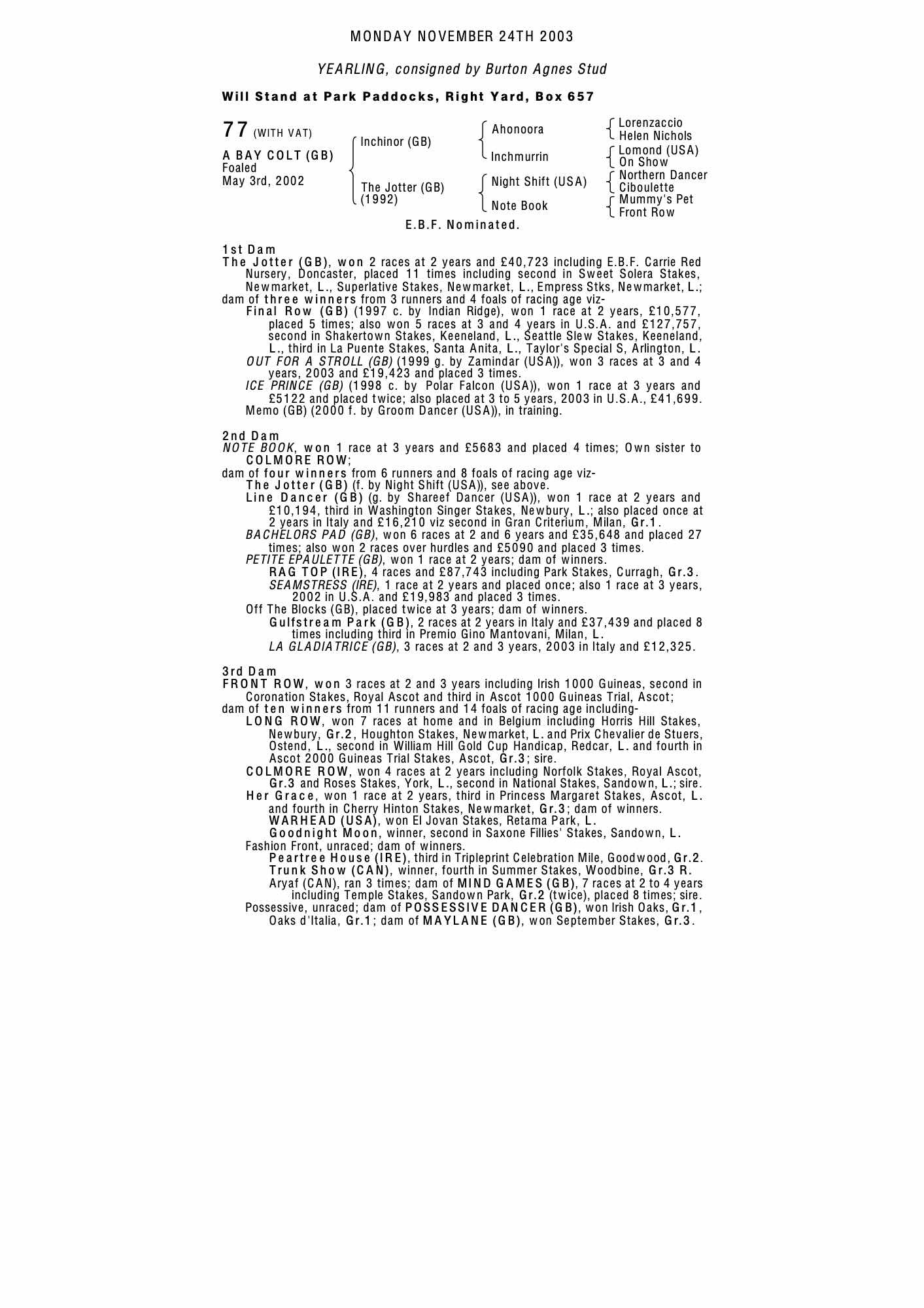 Autumn Horses in Training Sale 2002 lot 1007 Out For A Stroll (GB) (G. by Zamindar (USA)), Trillium Place Stables=>Vendor 20,000 gns
