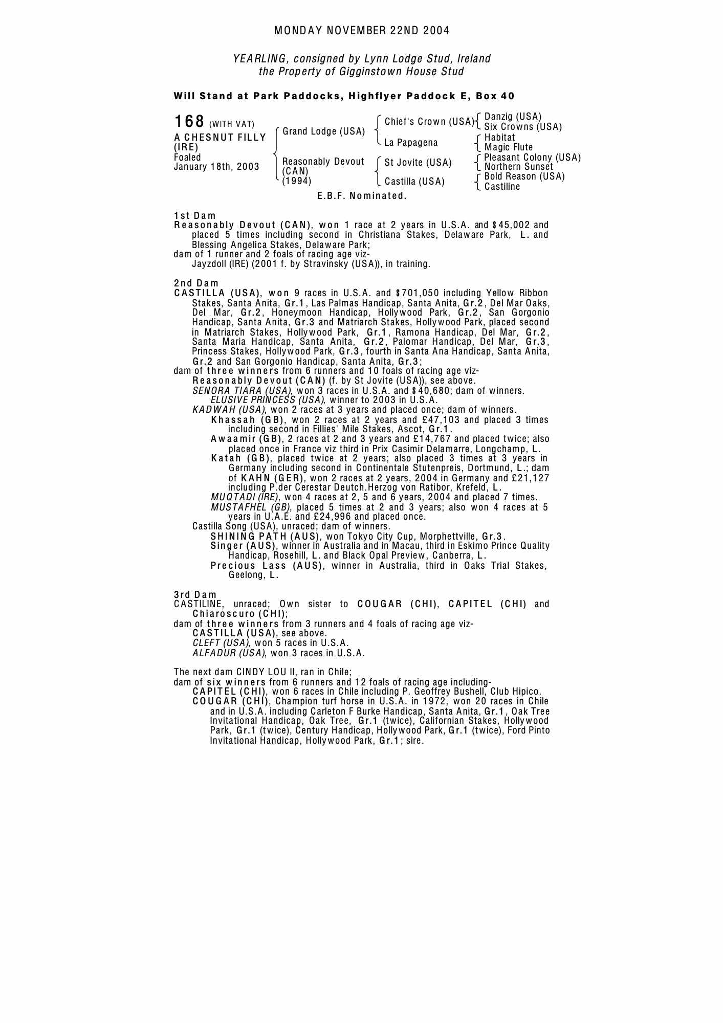 Houghton Yearling Sale 2001 lot 145 F. by King of Kings (IRE) , Lynn Lodge Stud, Ireland (Agent)=>Vendor 120,000 gns