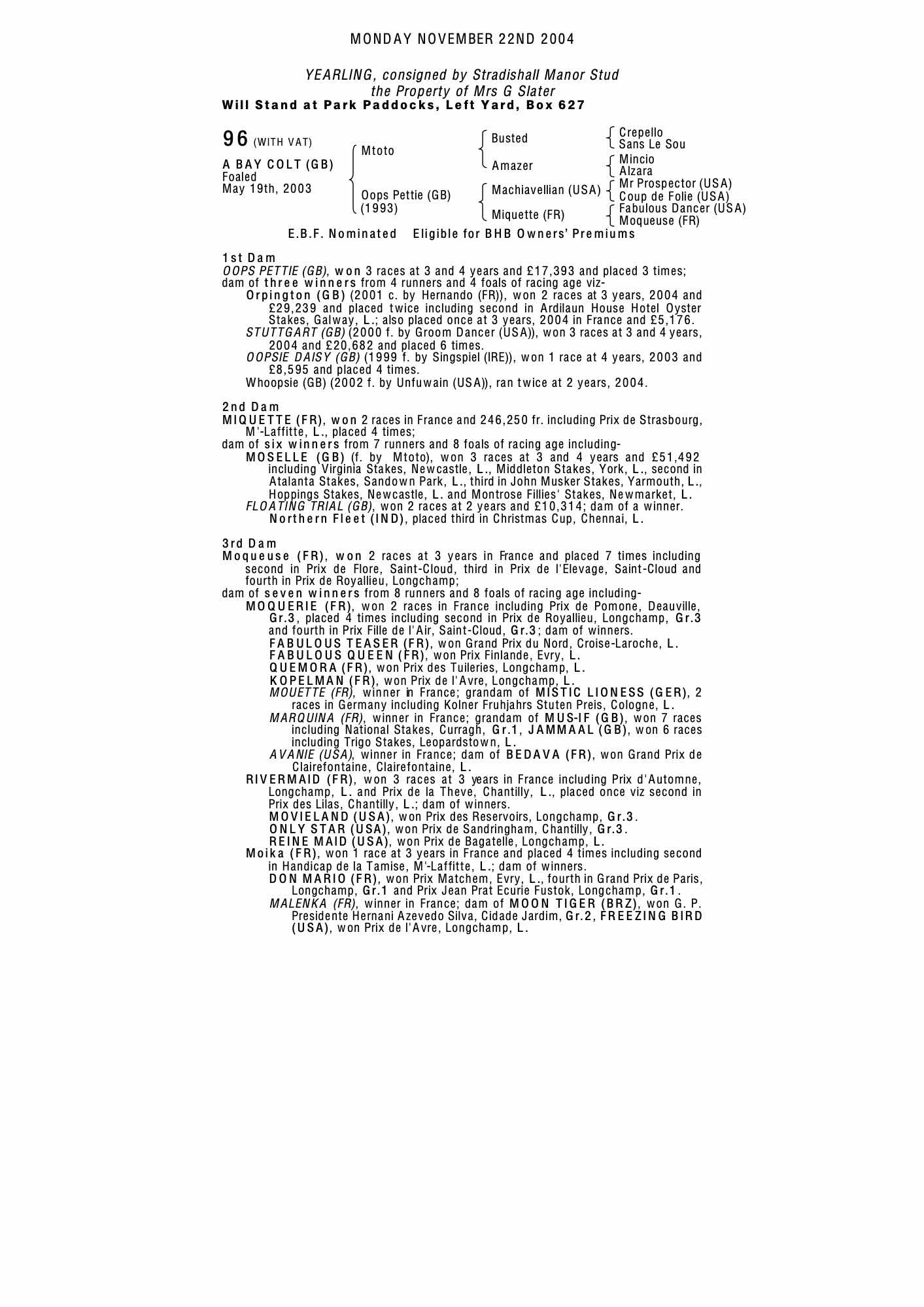 December Mare Sale 2003 lot 2260 Oopsie Daisy (GB) (F. by Singspiel (IRE)), Pegasus Stables=>Bodil Hallencreotz 10,500 gns