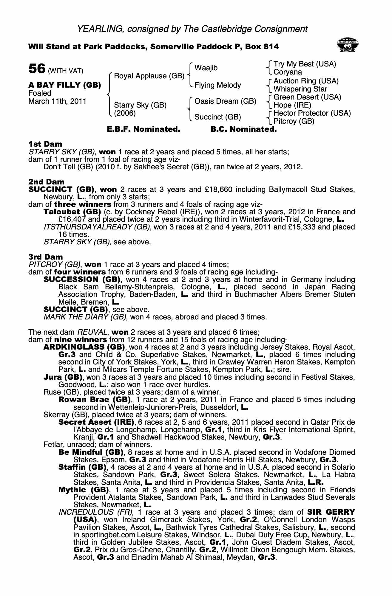 October Yearling Sale, Book 3 2011 lot 1596 F. by Sakhee's Secret (GB) 2010, Freedom Farm Stud=>Portanova Bloodstock 5,500 gns