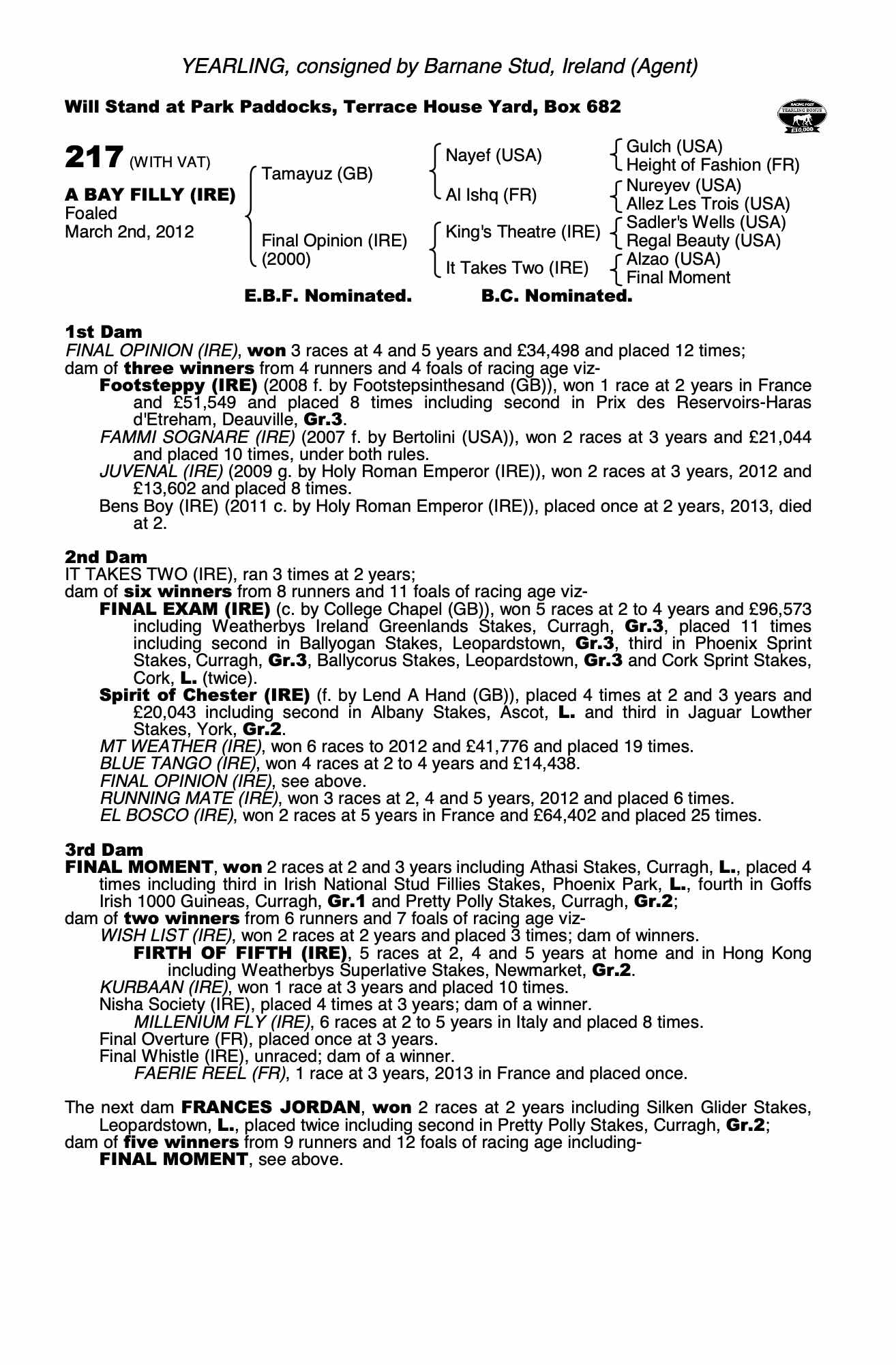 Consignor: Barnane Stud, Ireland (Agent)