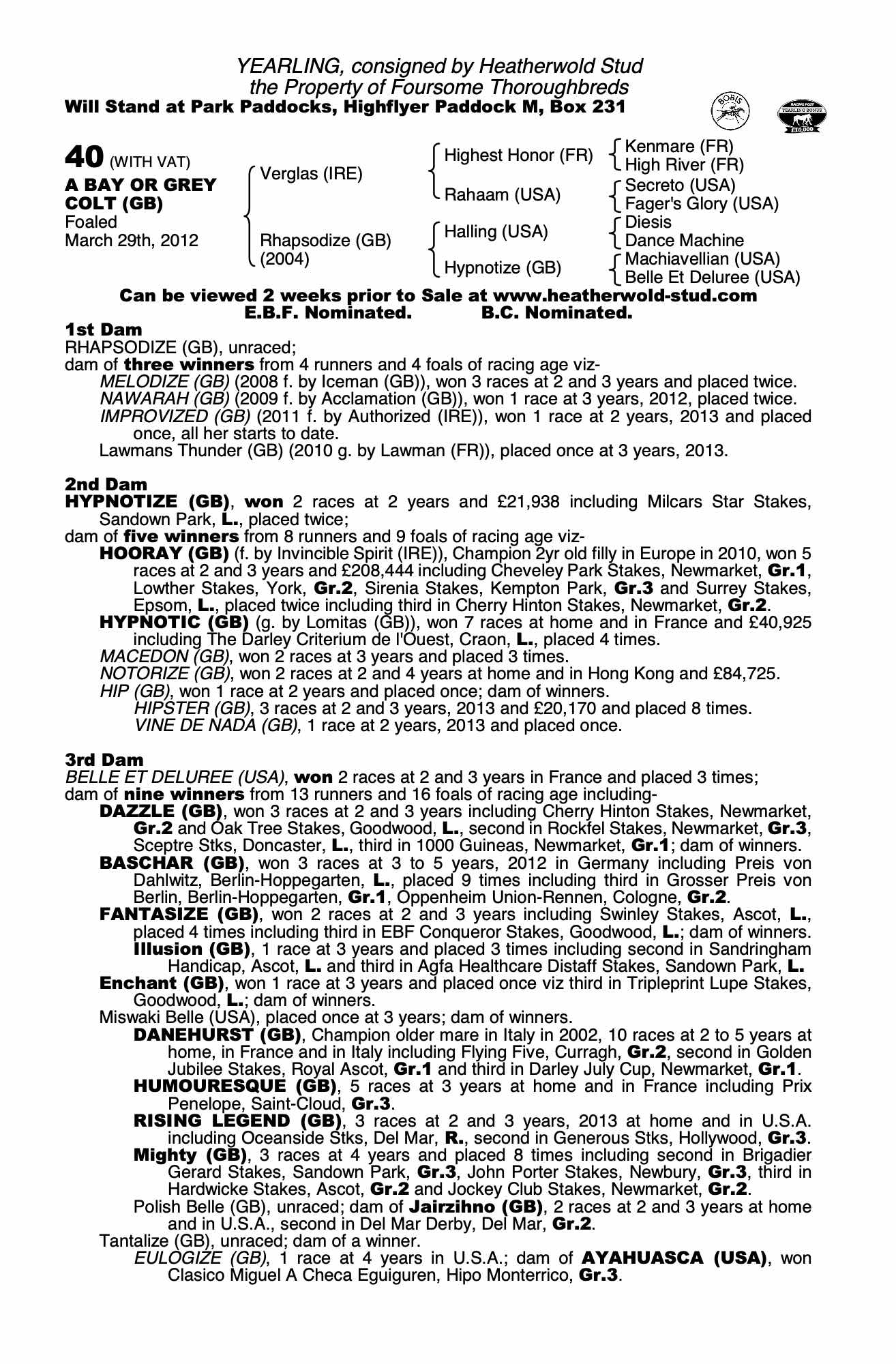 October Yearling Sale, Book 2 2012 lot 980 F. by Authorized (IRE) 2011, Hillwood Stud=>Vendor 13,000 gns