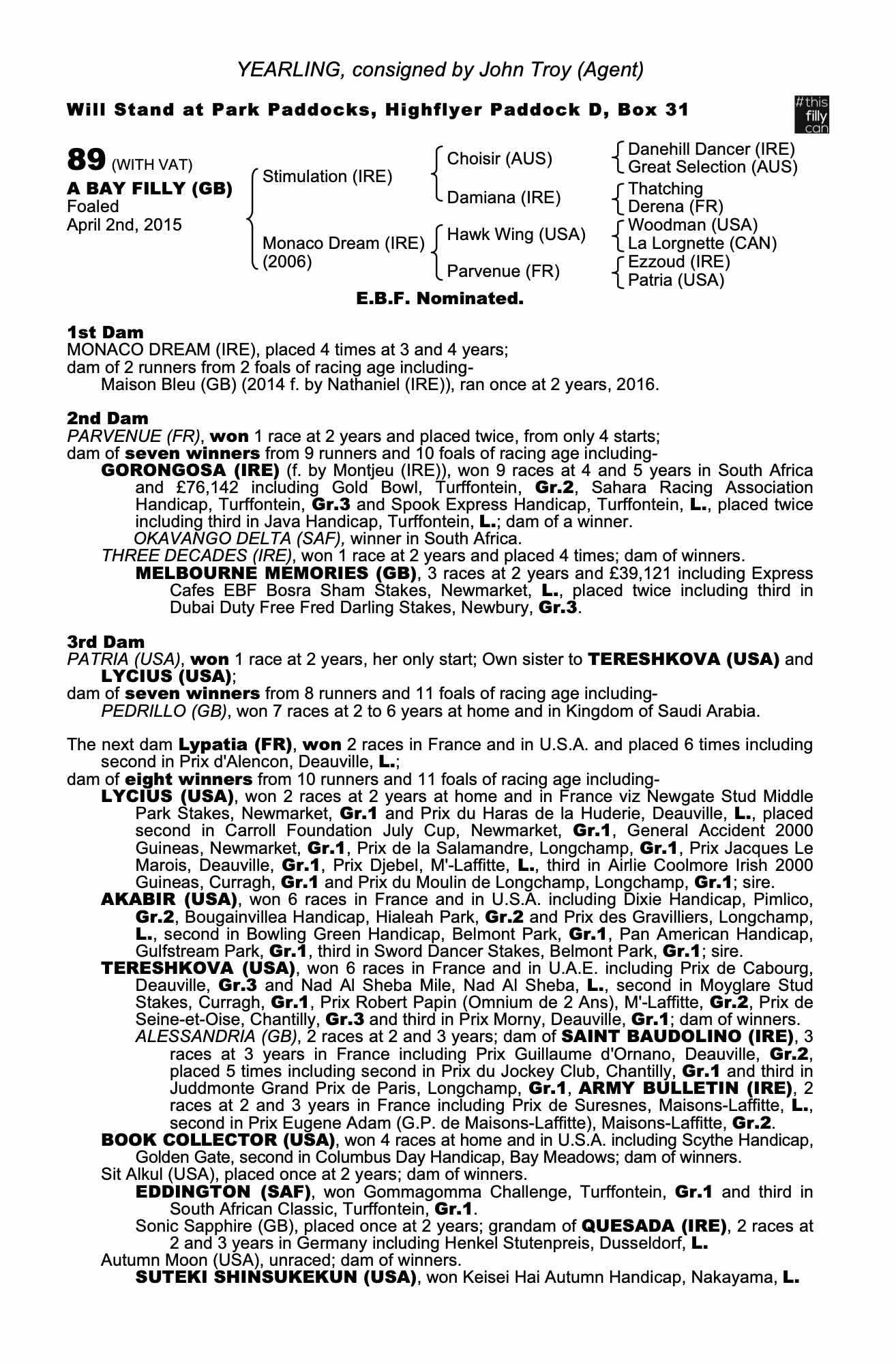 October Yearling Sale, Book 3 2019 lot 1892 F. by Sir Percy (GB) 2018, John Troy (Agent)=>Lot Not Sold 1,800 gns