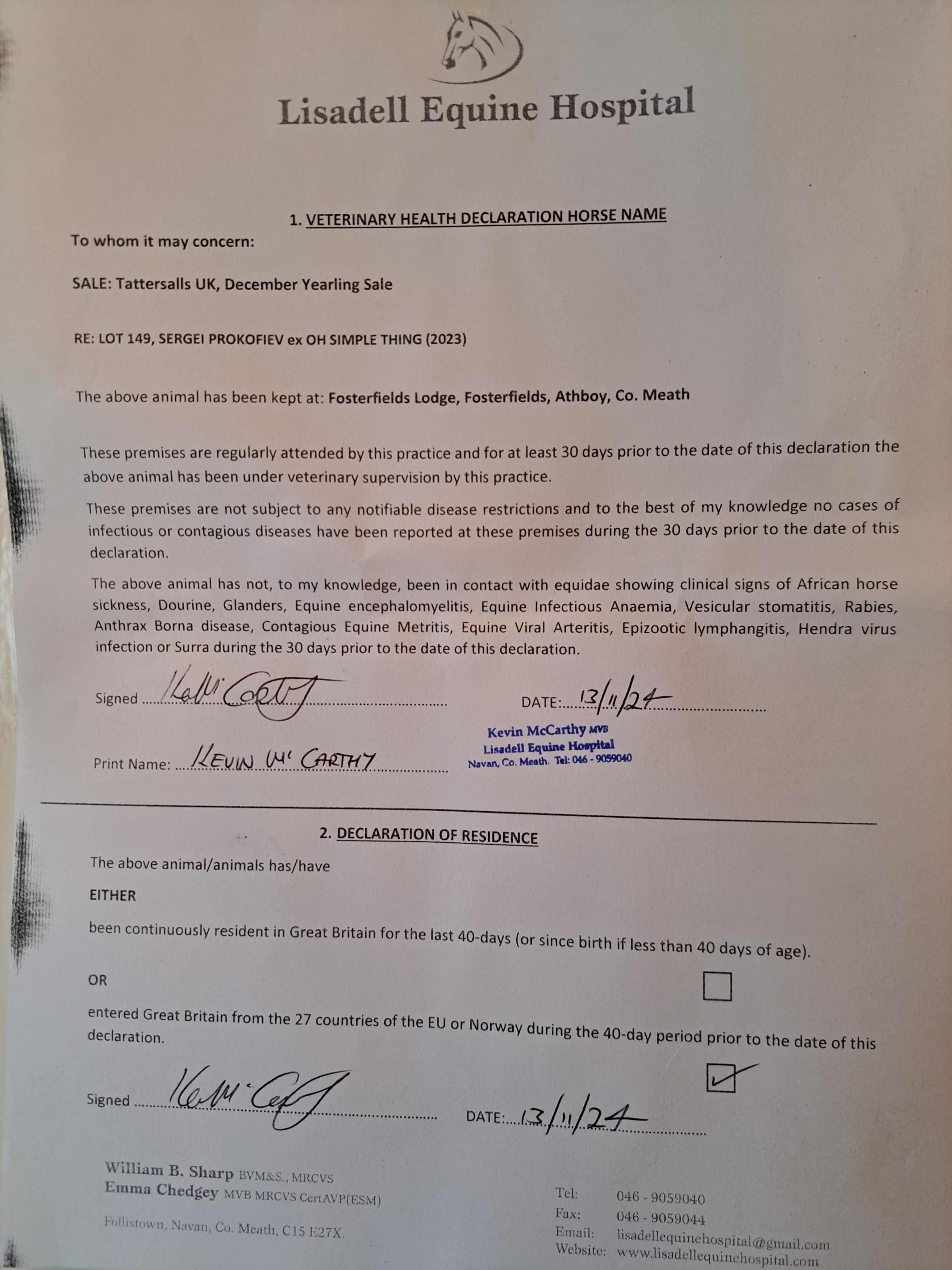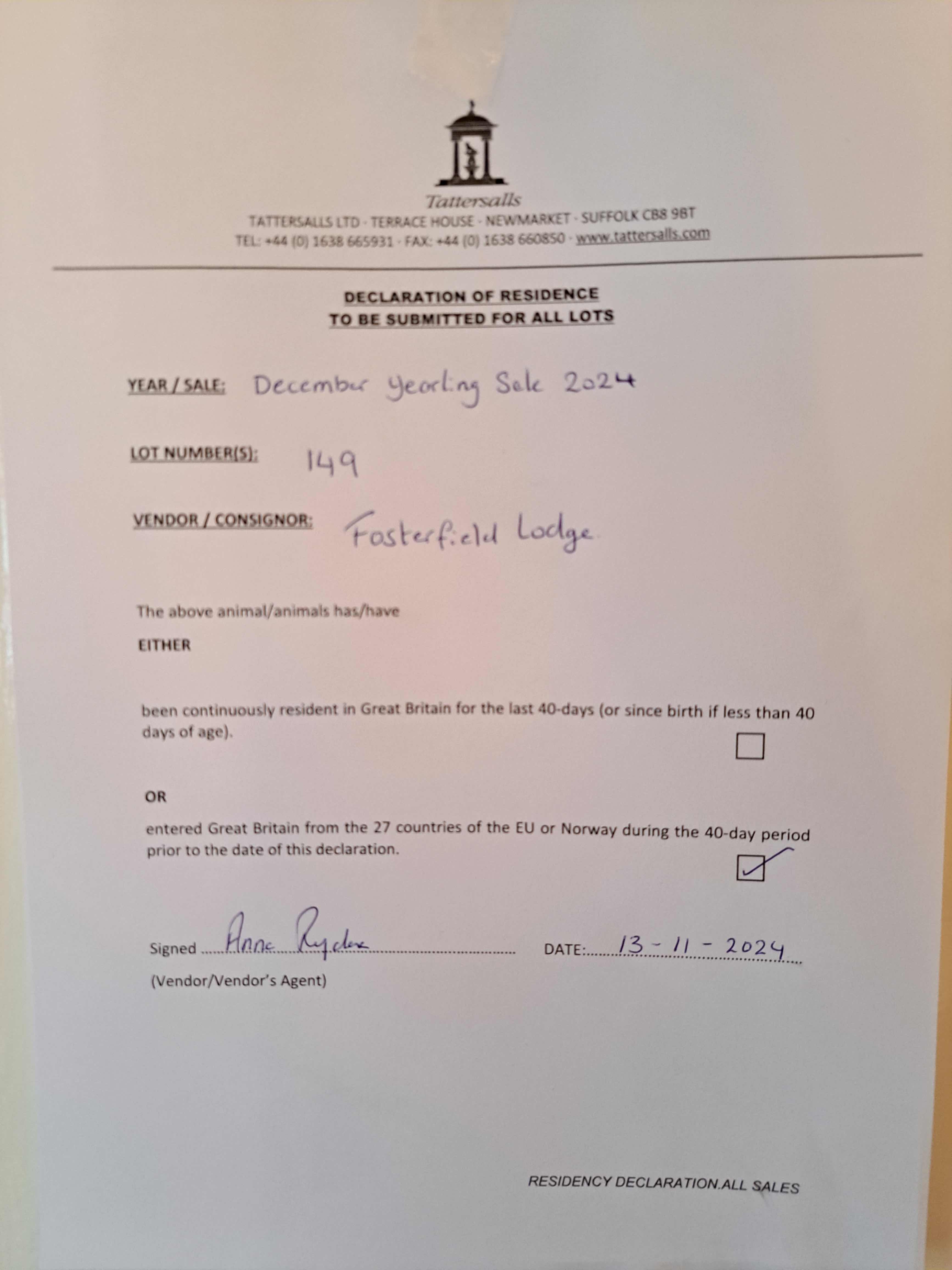 Consignor: Fosterfield Lodge, Ireland